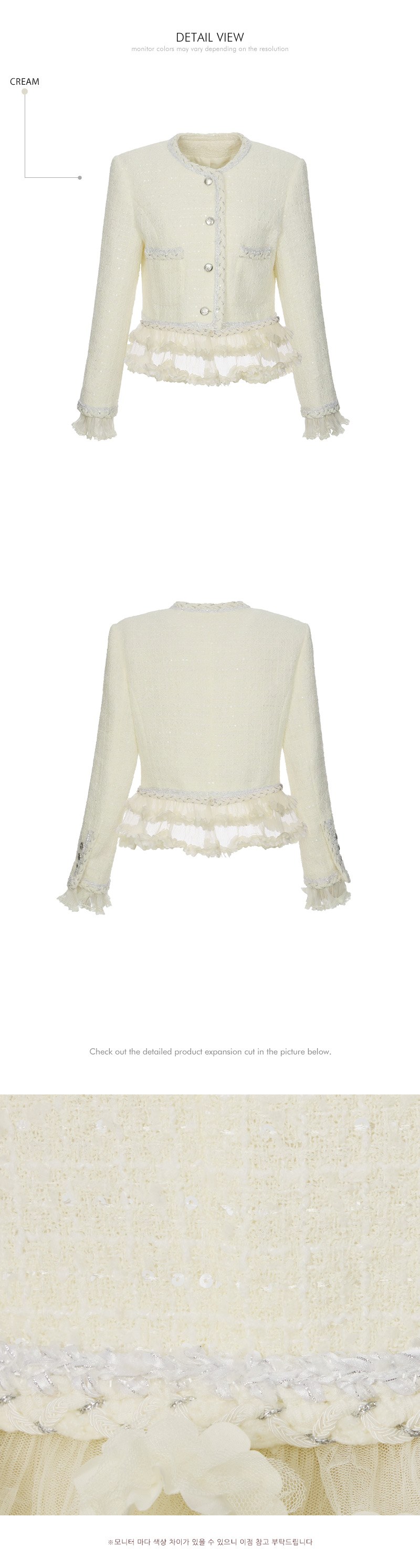 전면 4개 버튼 여밈으로 클래식하게 마무리되며,