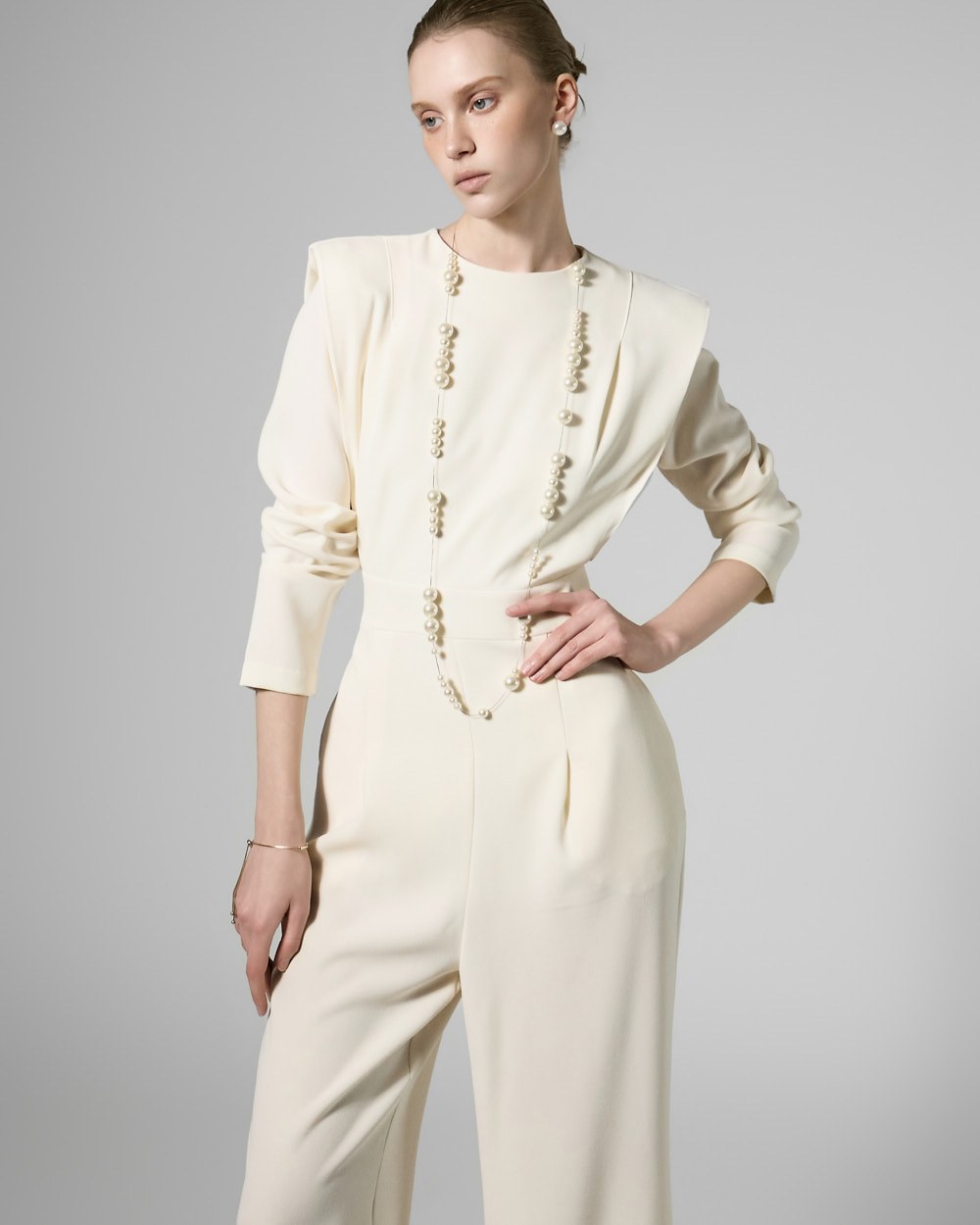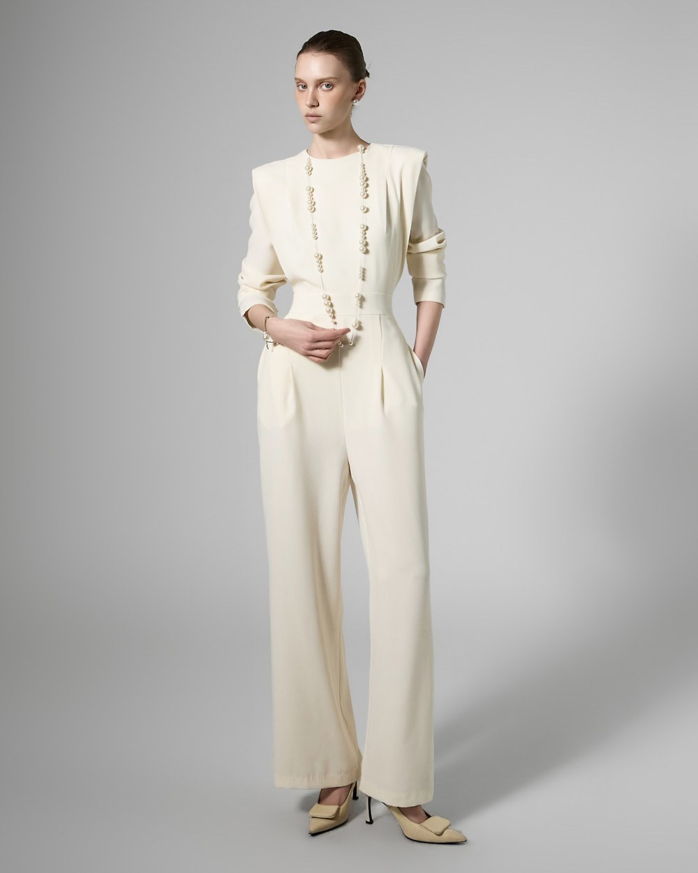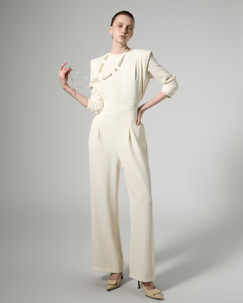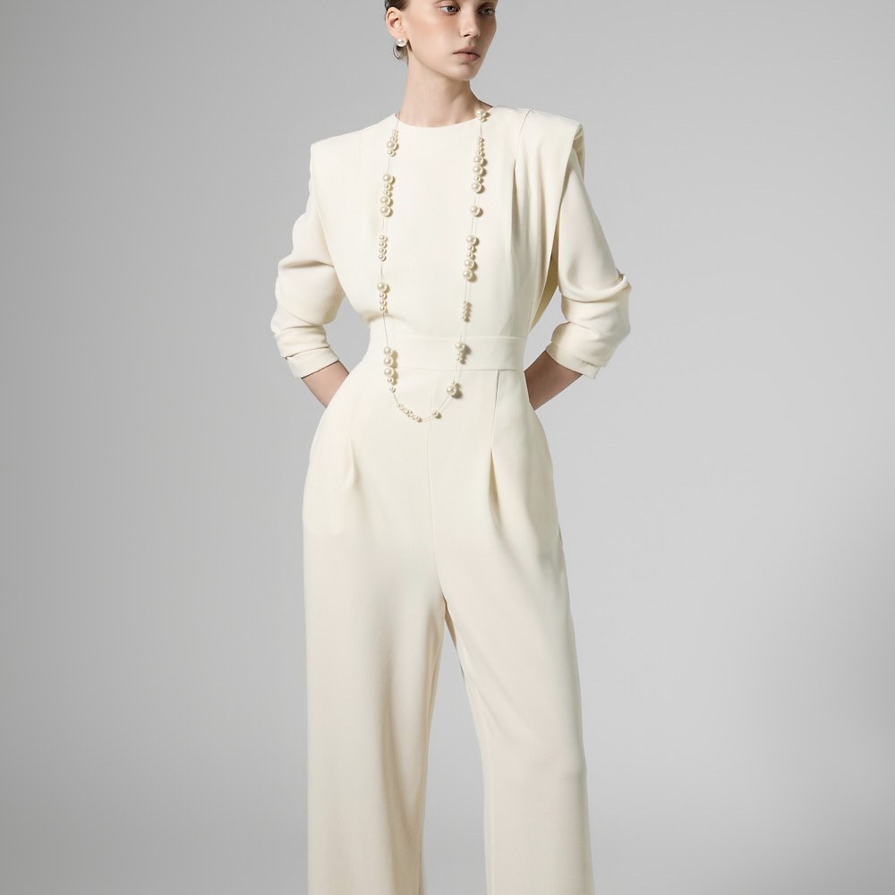 모던한 무드의 패드 숄더 점프수트입니다.