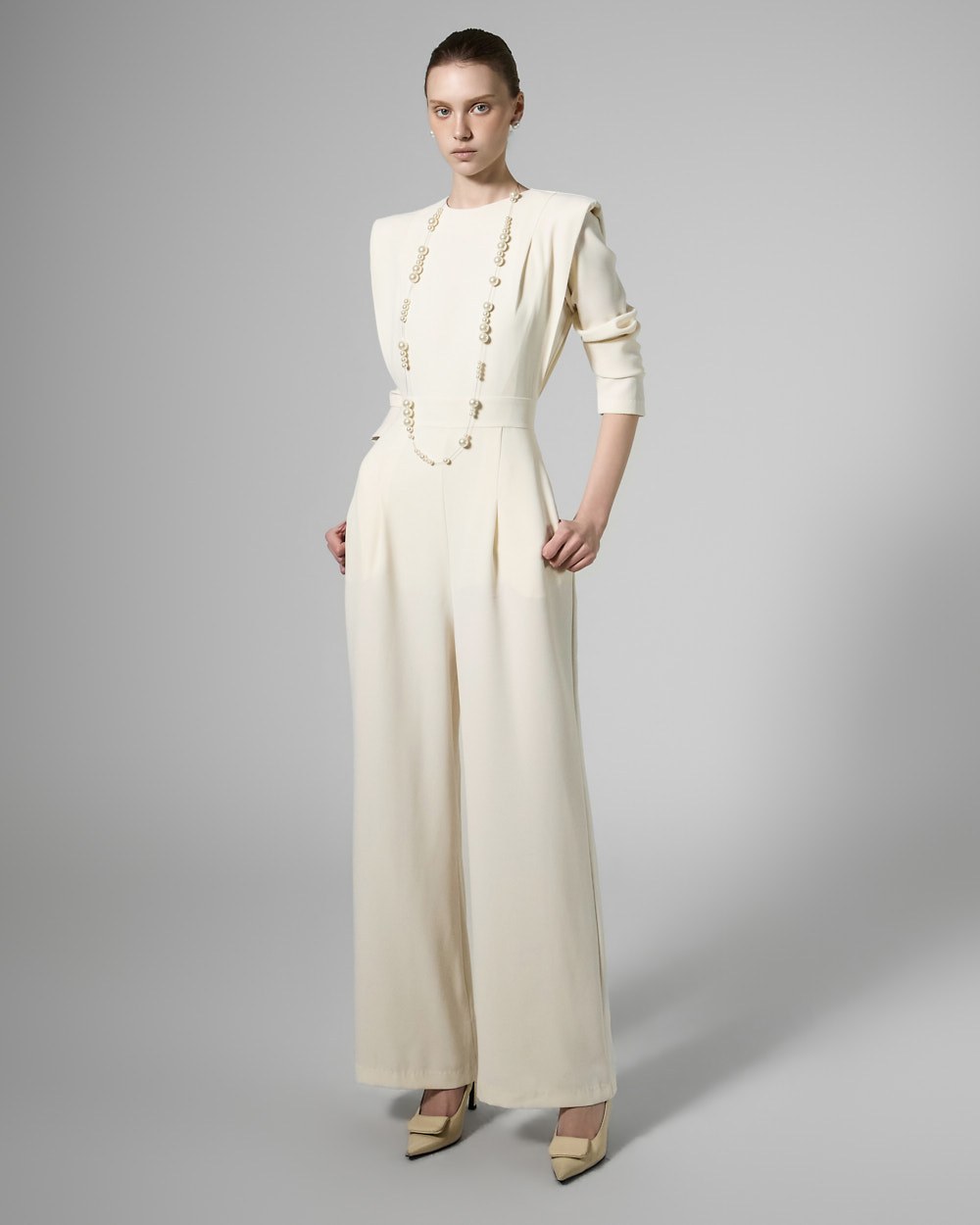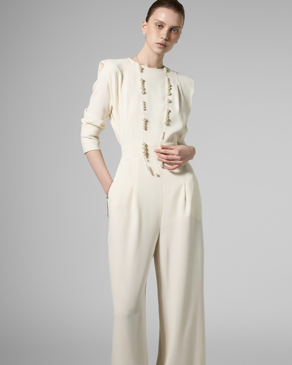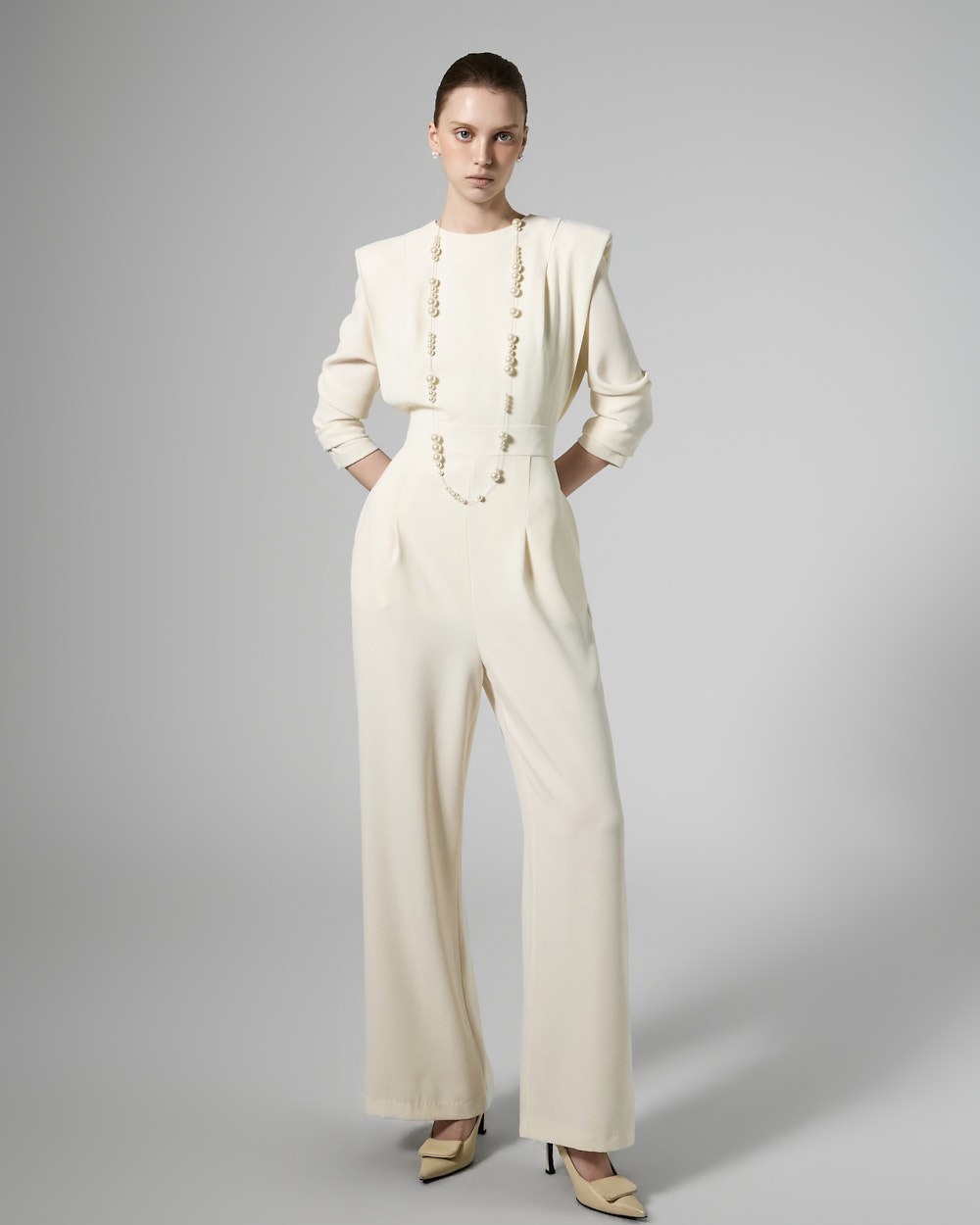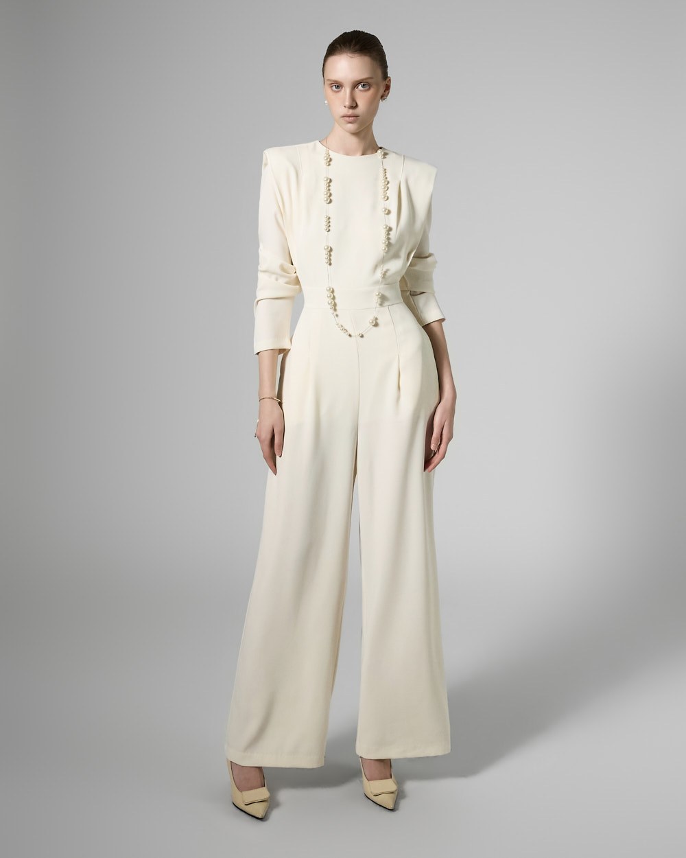 모던한 무드의 패드 숄더 점프수트입니다.