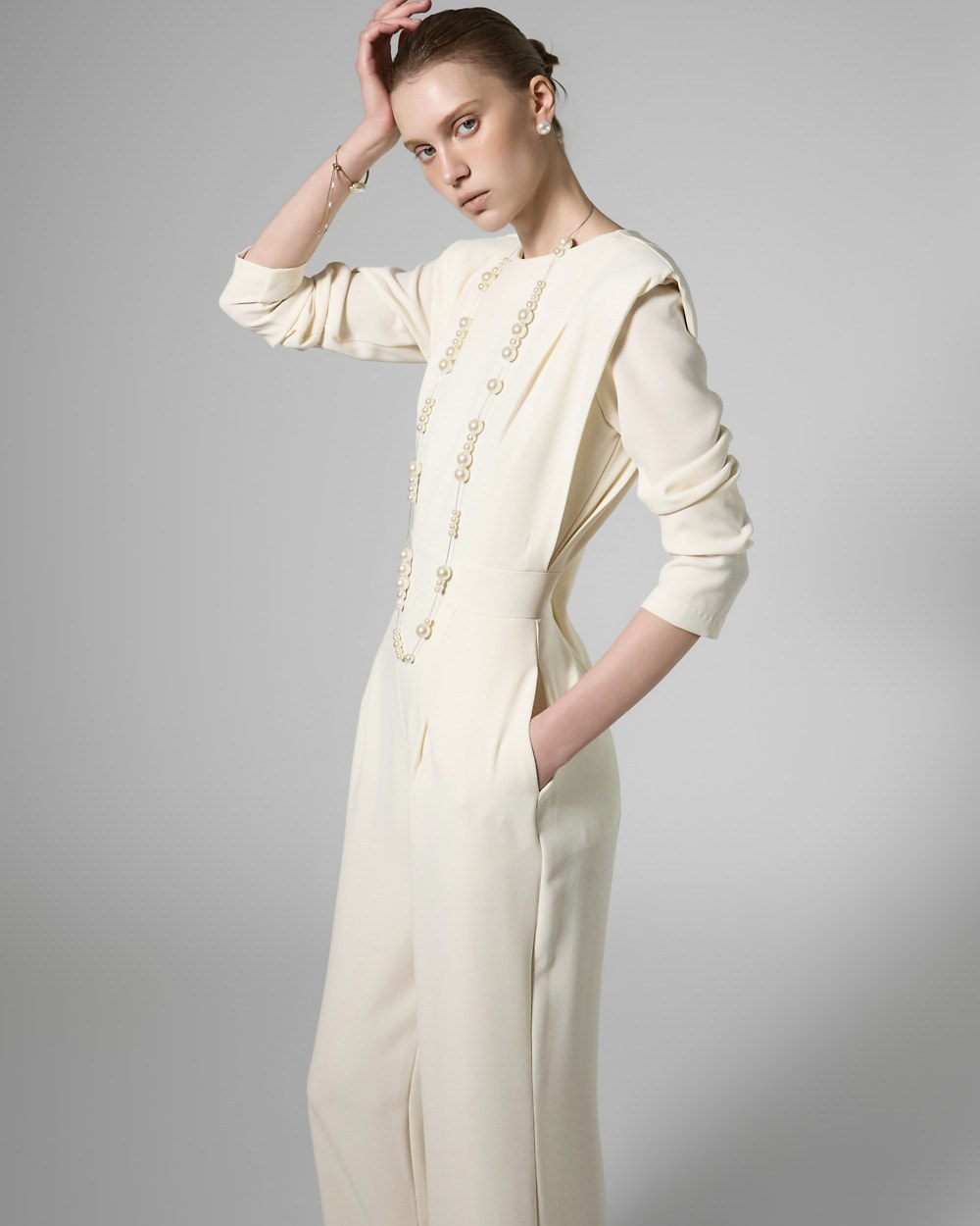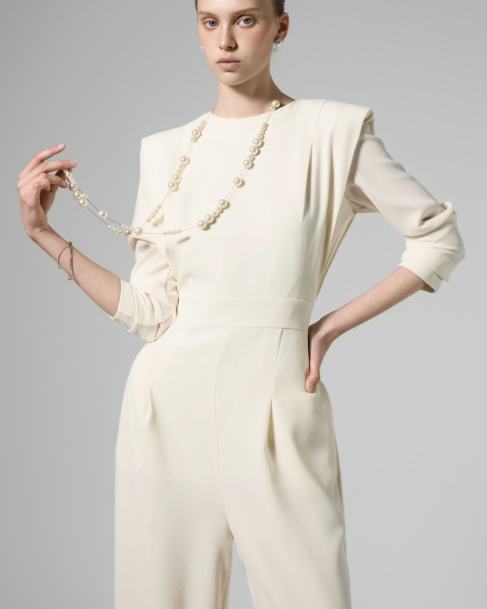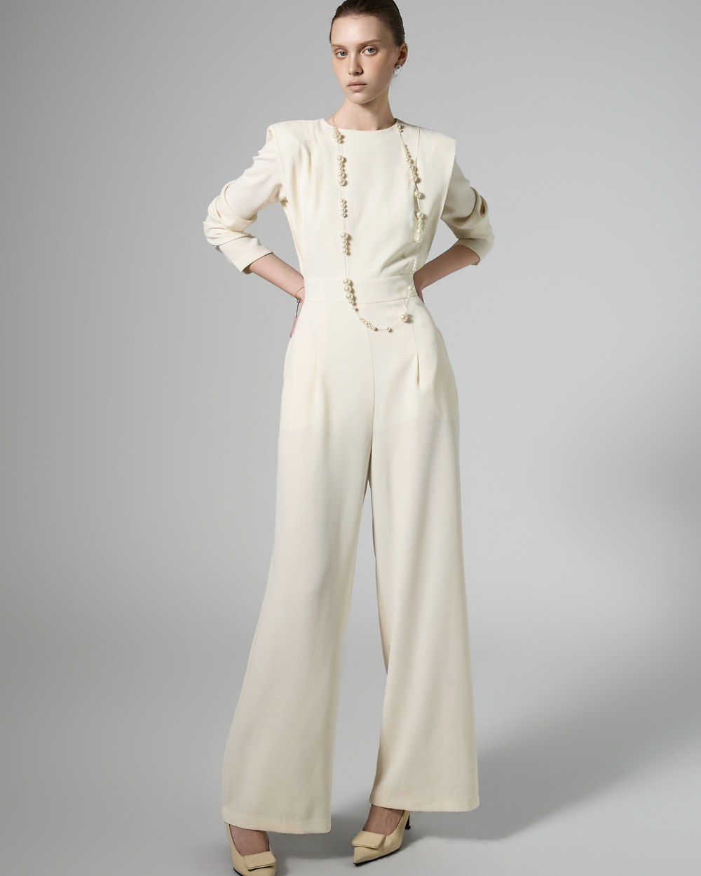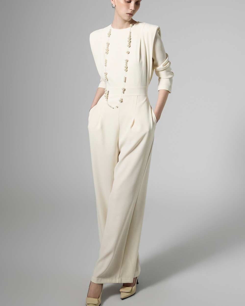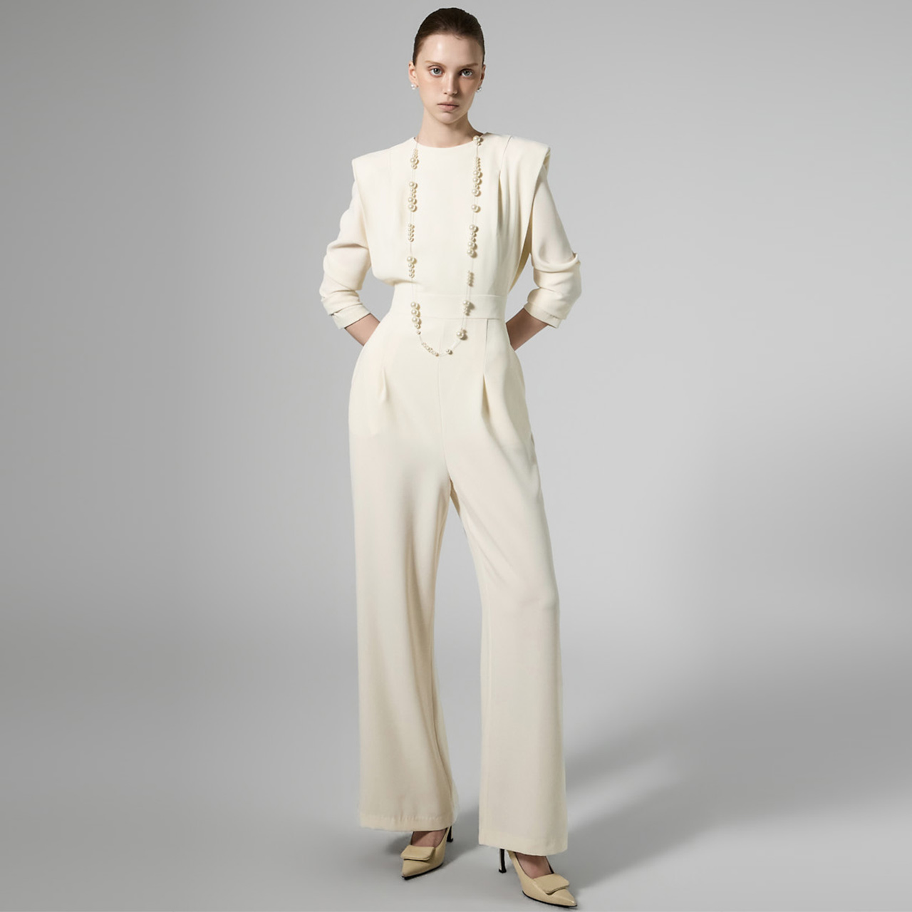 모던한 무드의 패드 숄더 점프수트입니다.