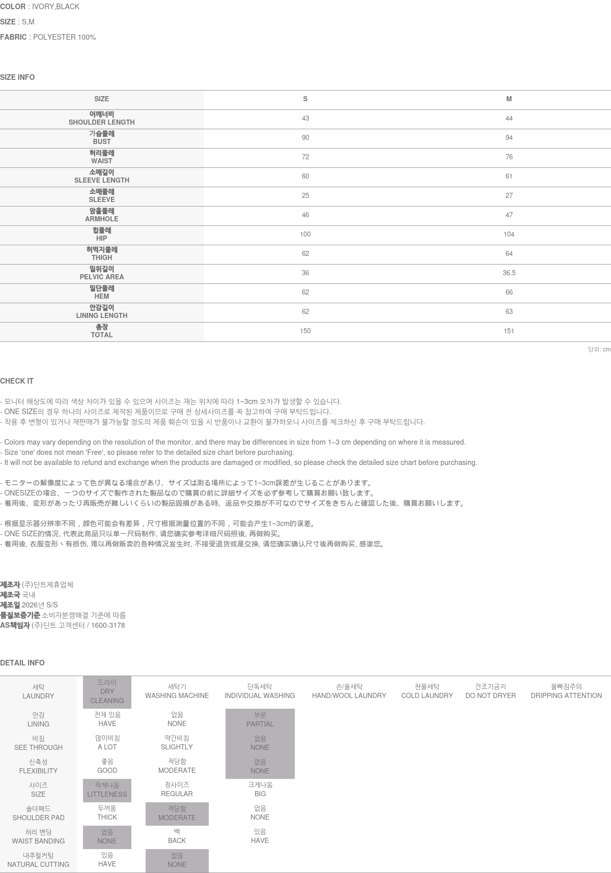 174CM 모델 S 사이즈, IVORY 컬러 착용하였습니다.