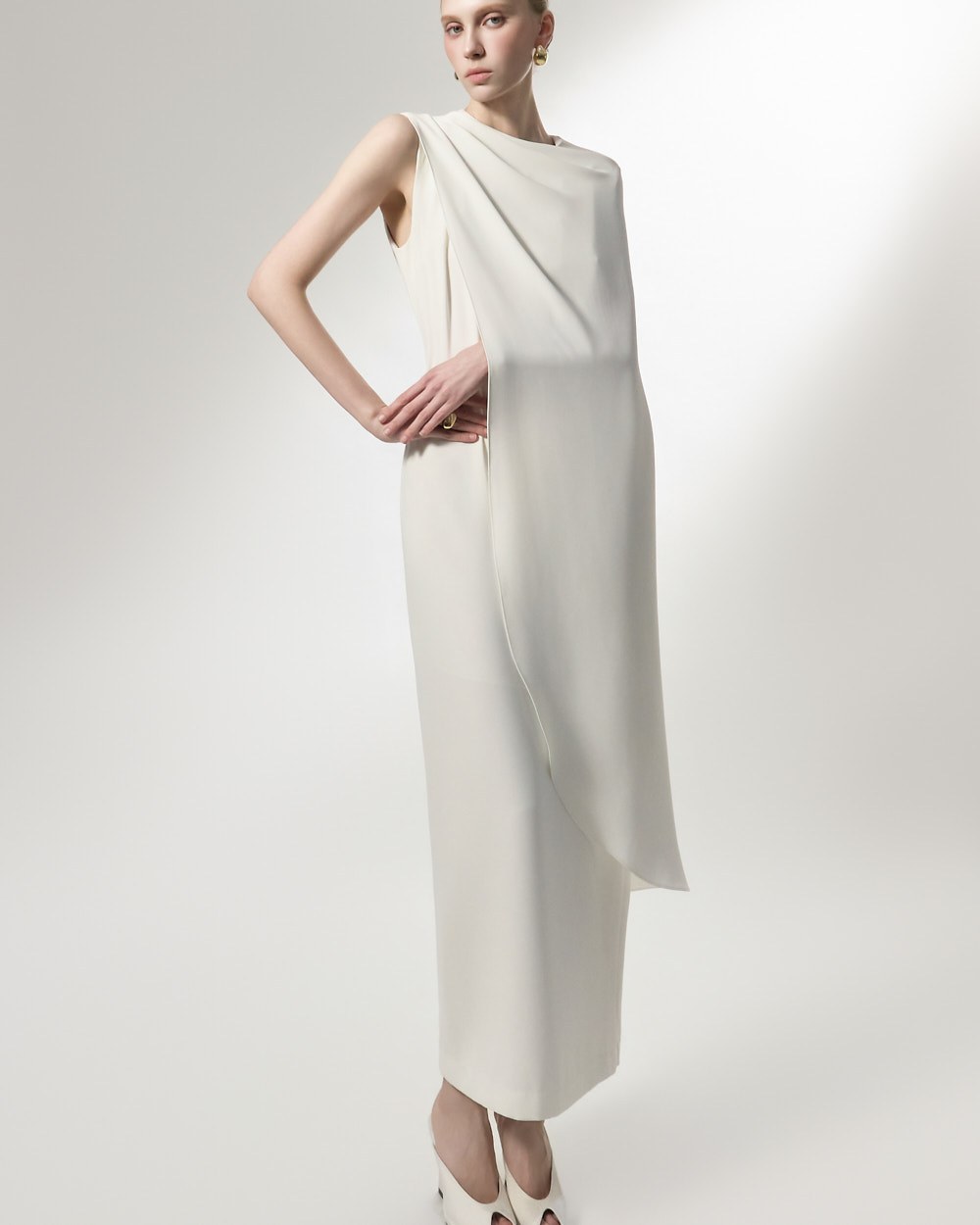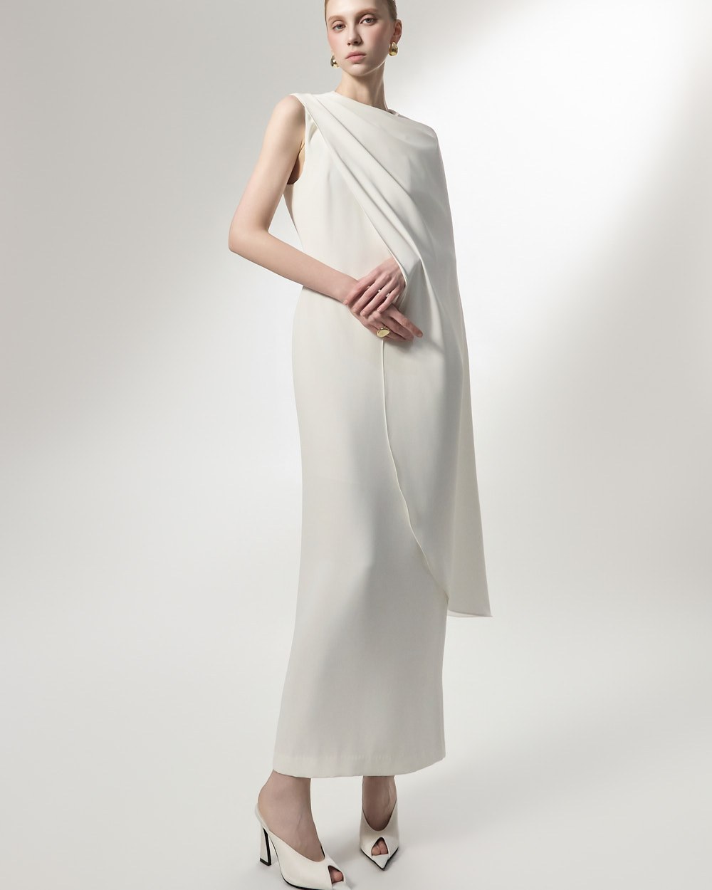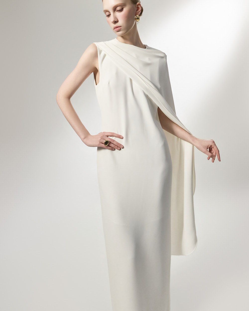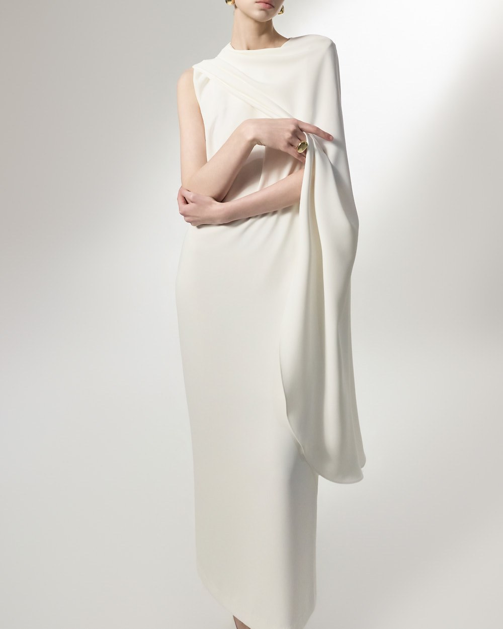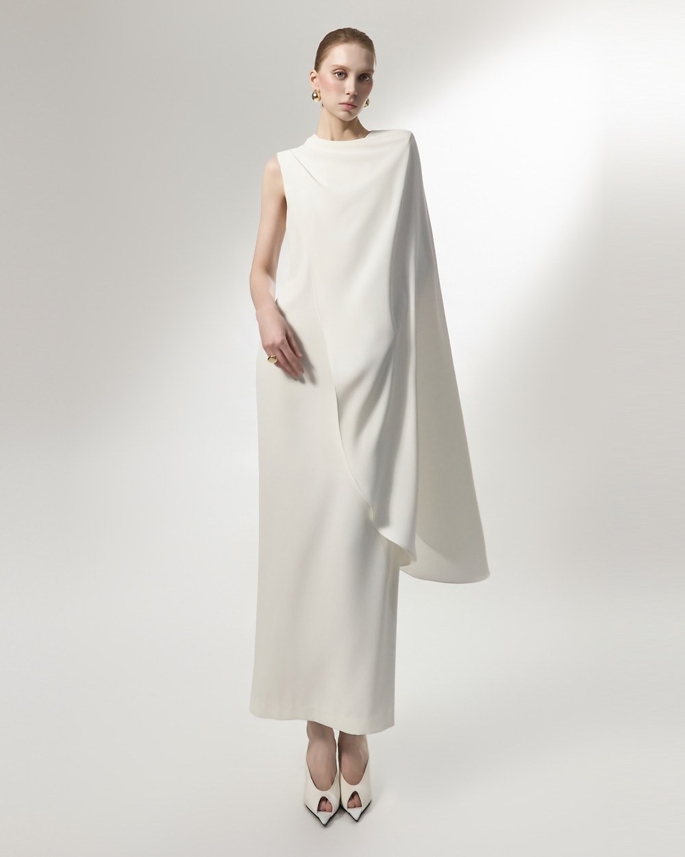 우아한 무드의 드레이프 케이프 맥시 원피스입니다.