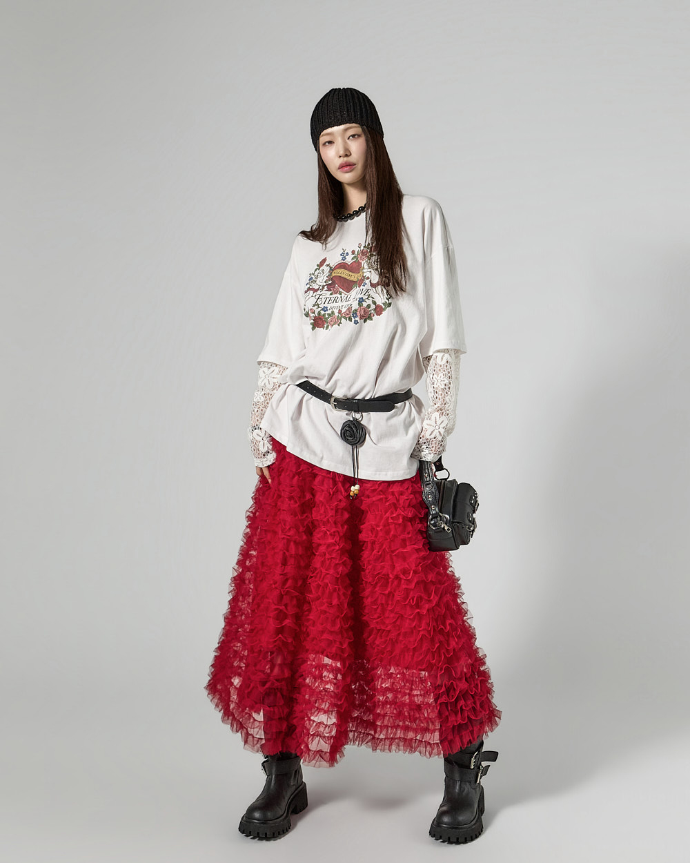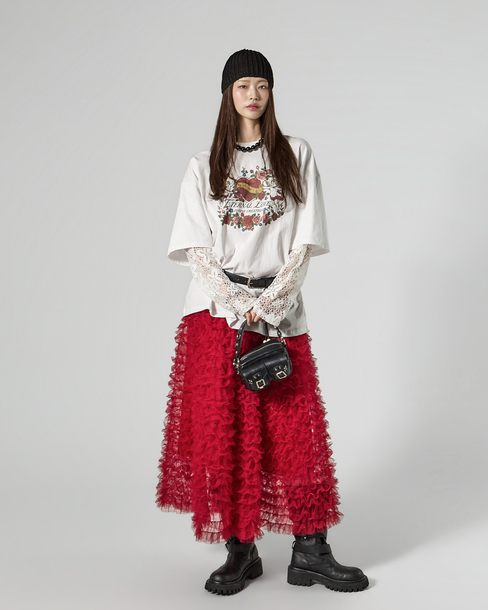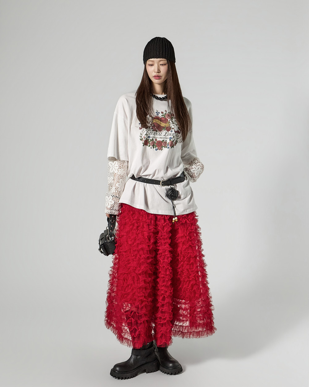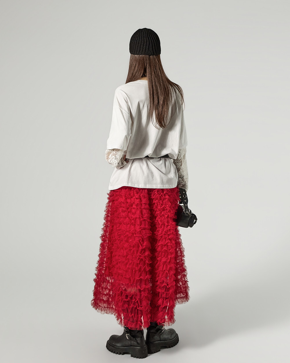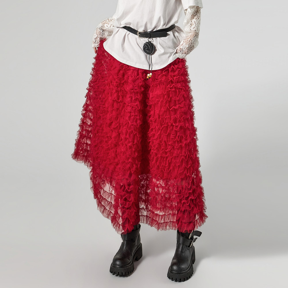 유니크하면서 러블리한 프릴 티어드 스커트입니다.
