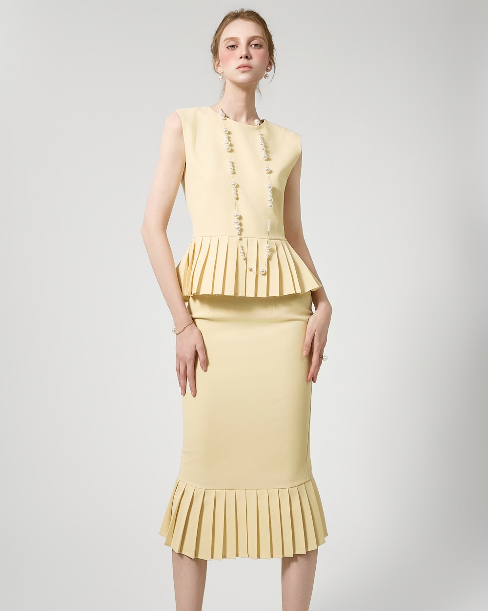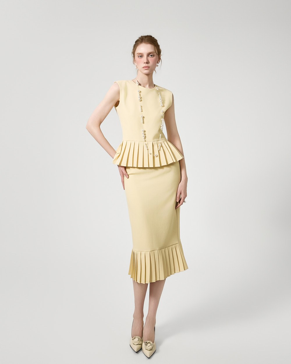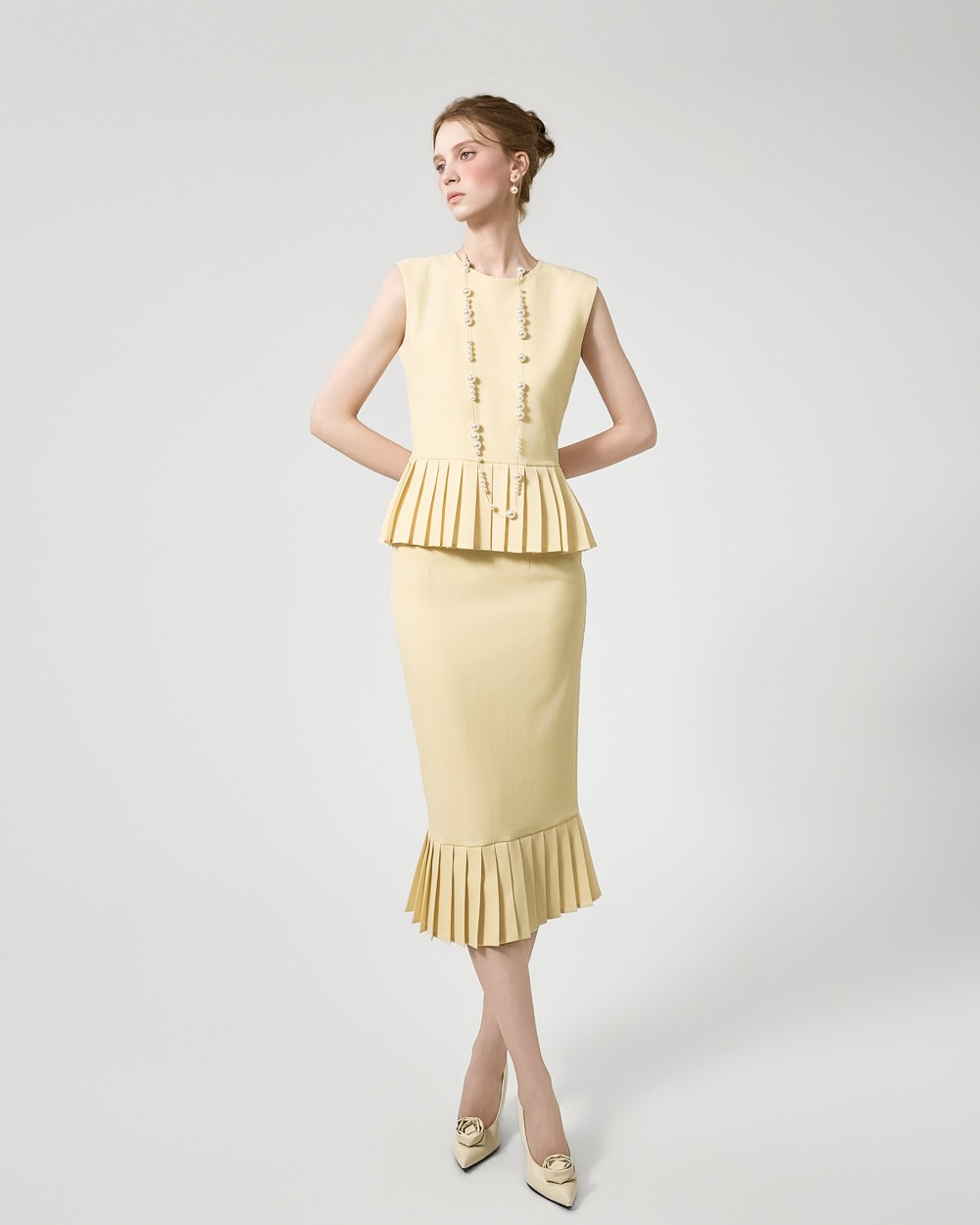 탑은 허리 라인의 플리츠 디테일로 입체감을 더해주며,