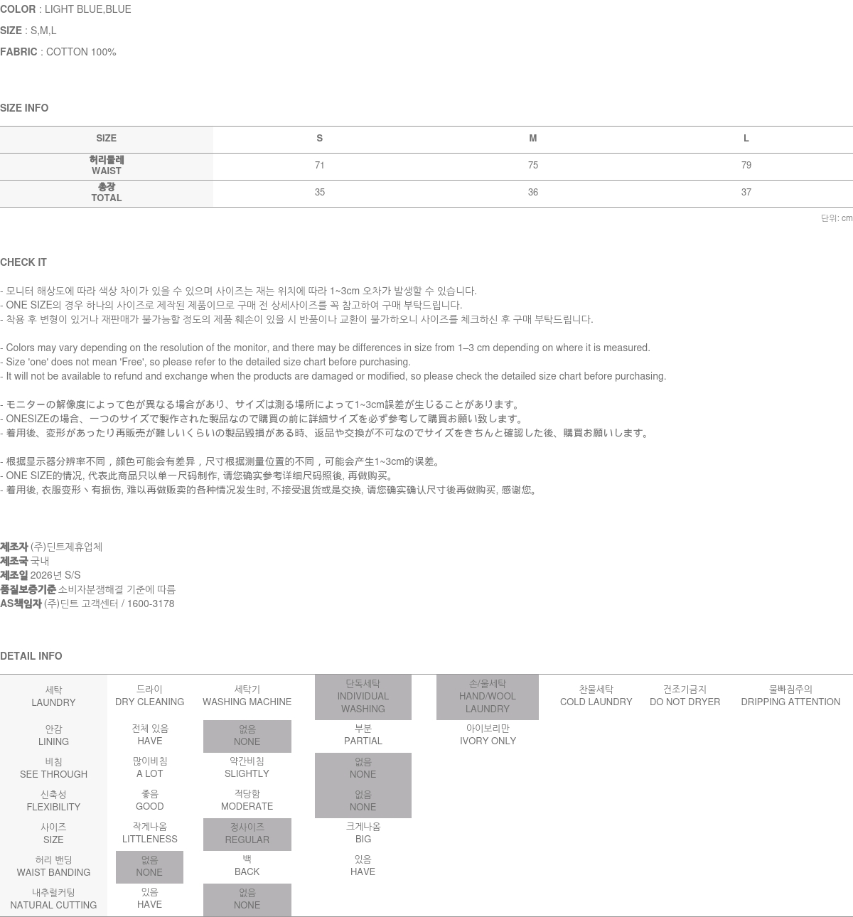- (주)딘트의 의류는 일반 세탁 및 건조기 사용 시 원단의 변형이나 제품 손상의 원인이 될 수 있으므로, 하단에 안내된 세탁 방법을 따라주시기를 권장합니다.