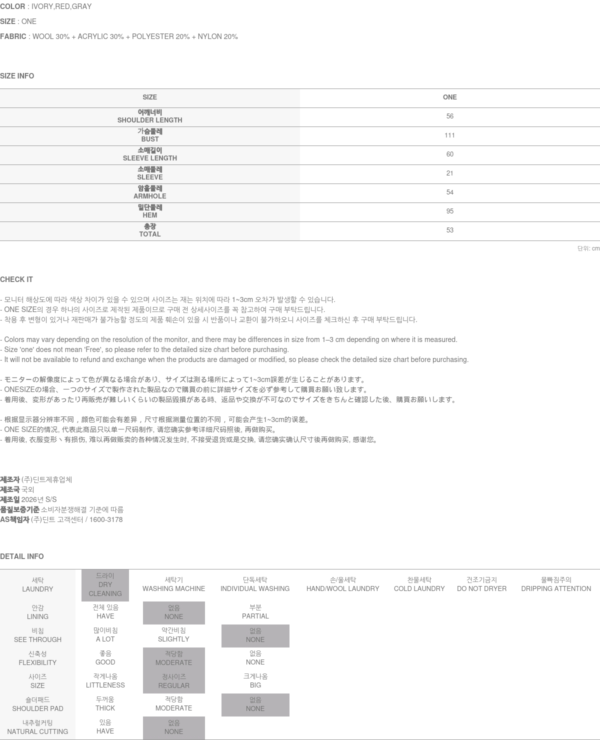 - (주)딘트의 의류는 일반 세탁 및 건조기 사용 시 원단의 변형이나 제품 손상의 원인이 될 수 있으므로, 하단에 안내된 세탁 방법을 따라주시기를 권장합니다.