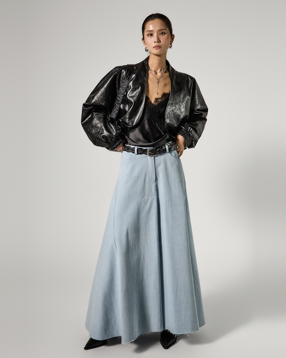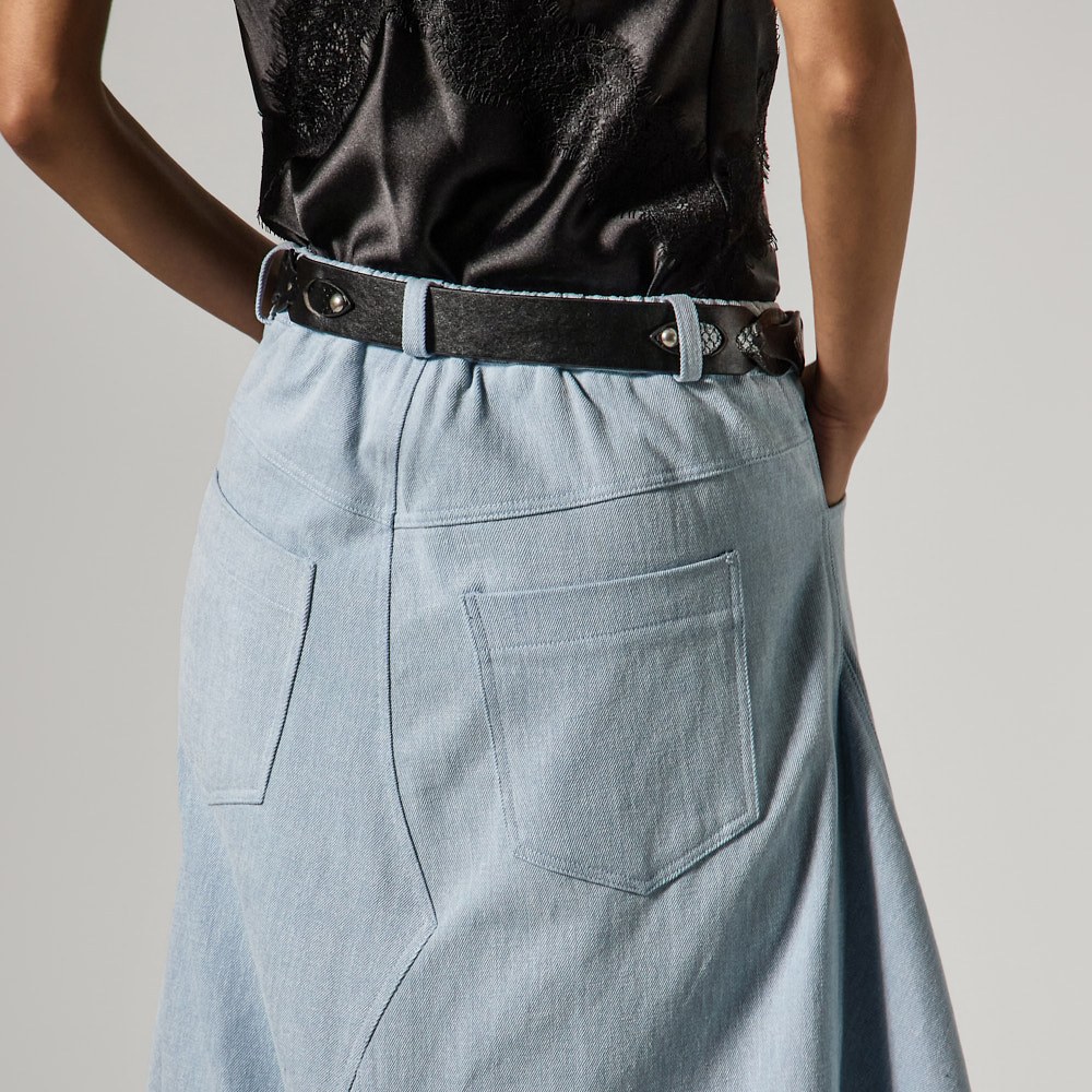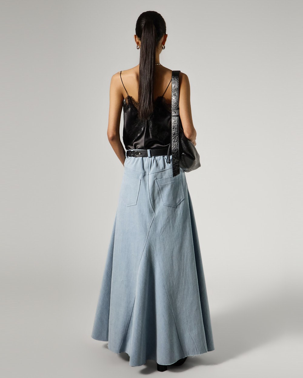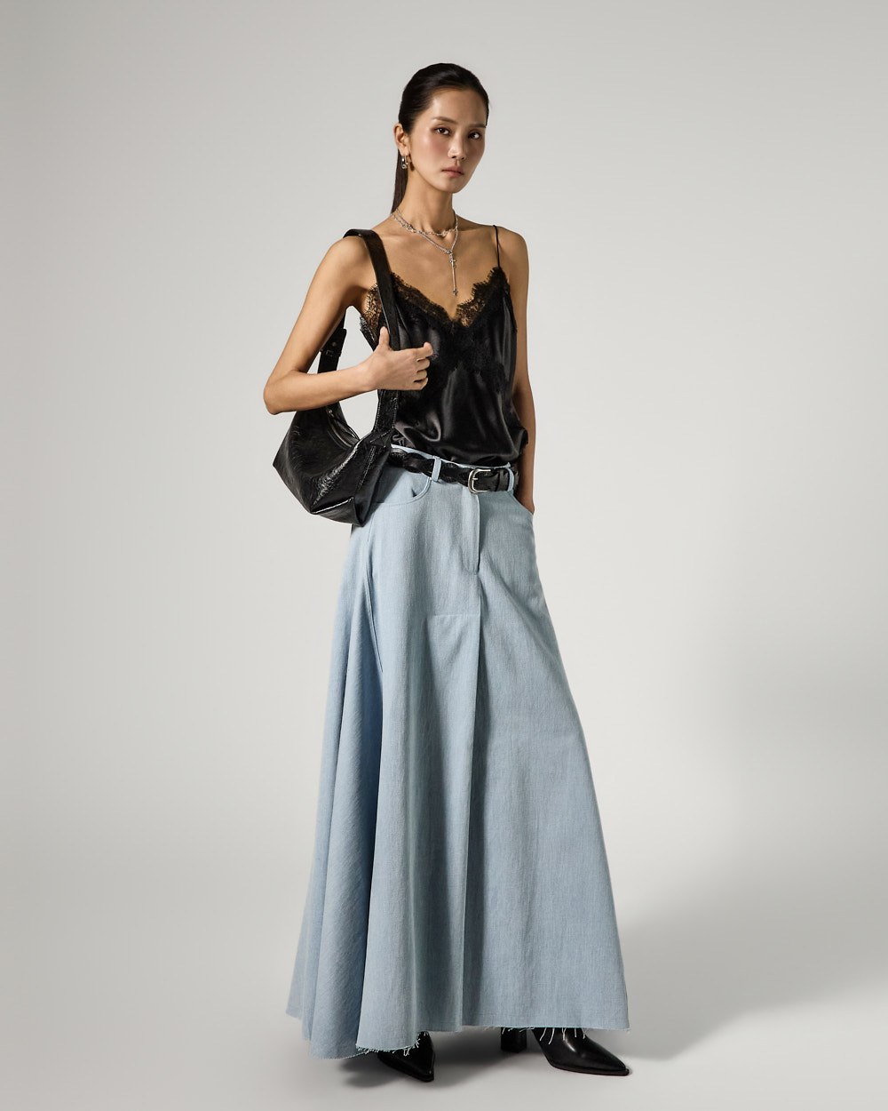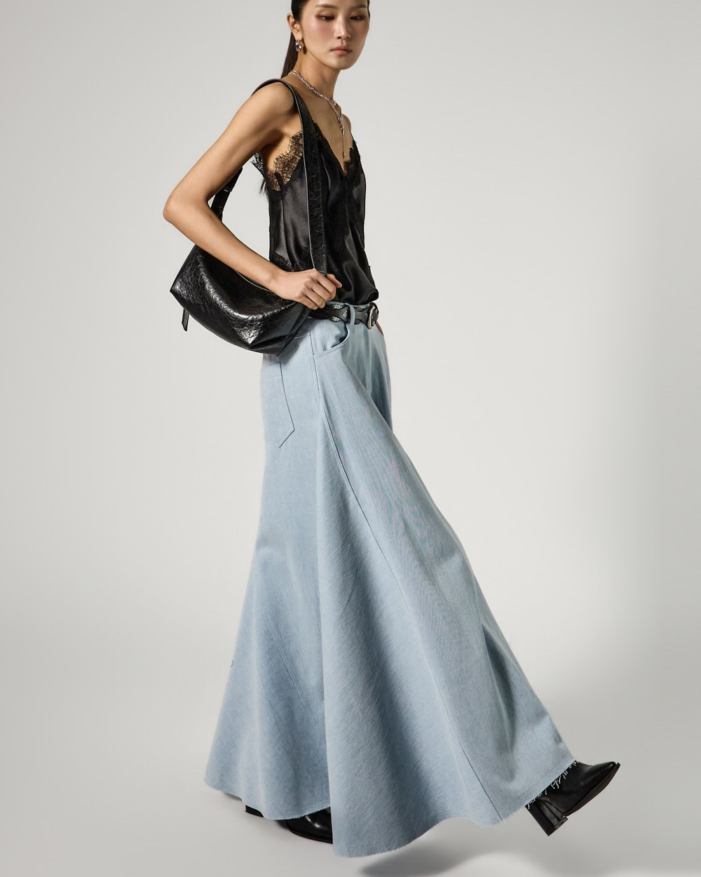 캐주얼하면서 미니멀한 무드의 데님 맥시 스커트입니다.