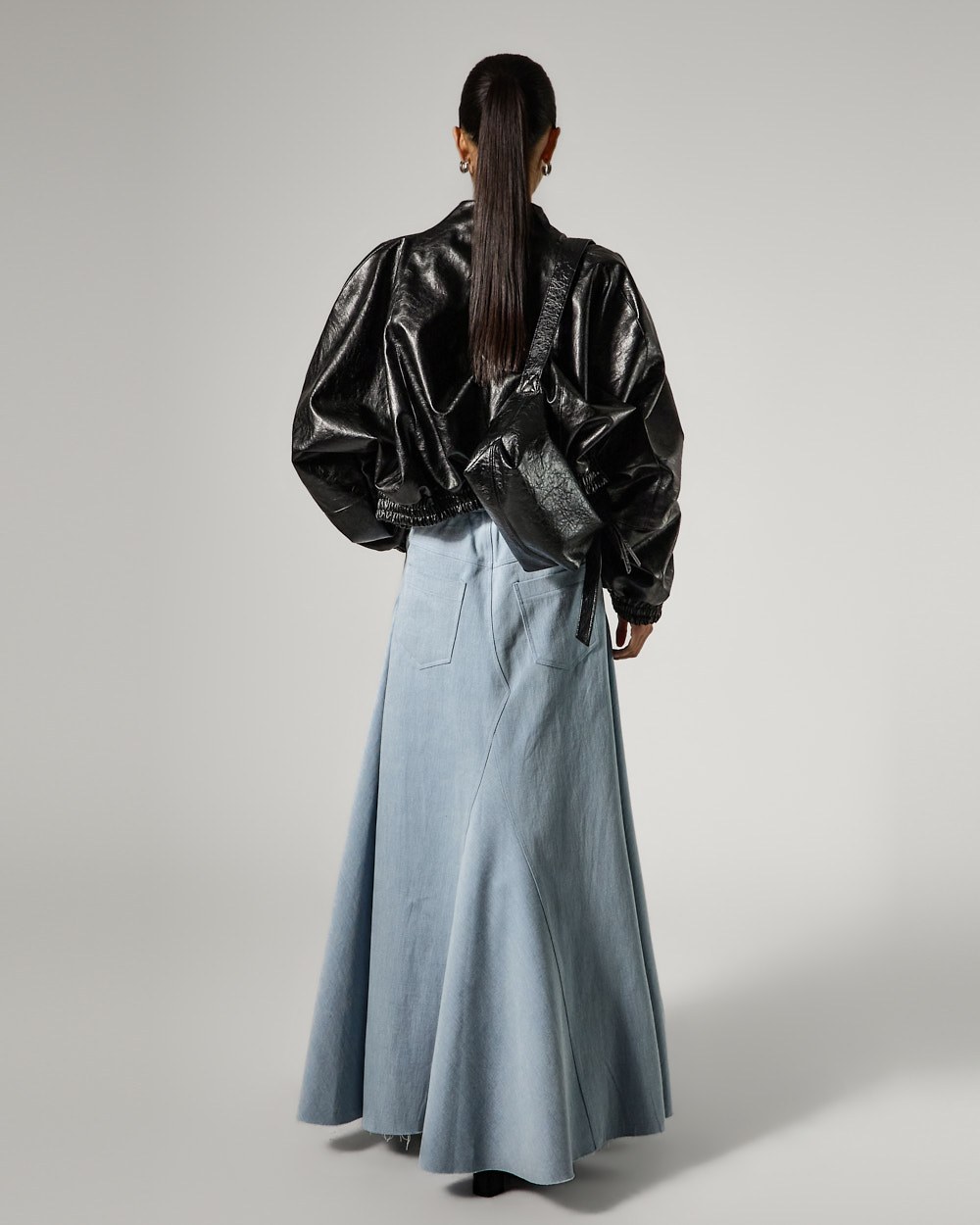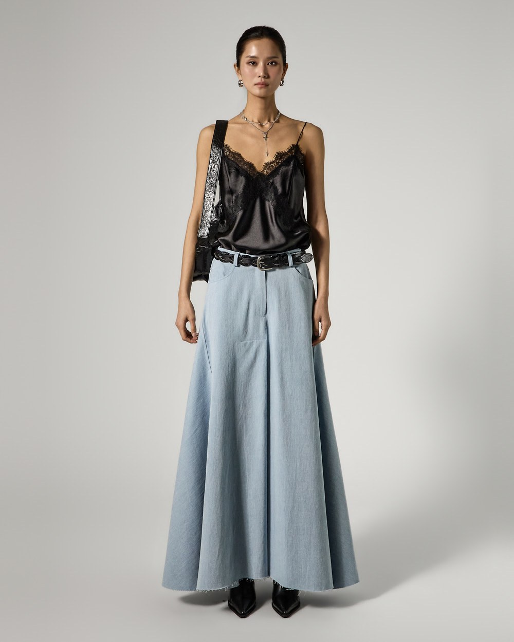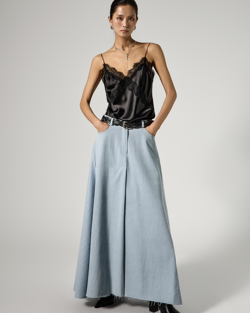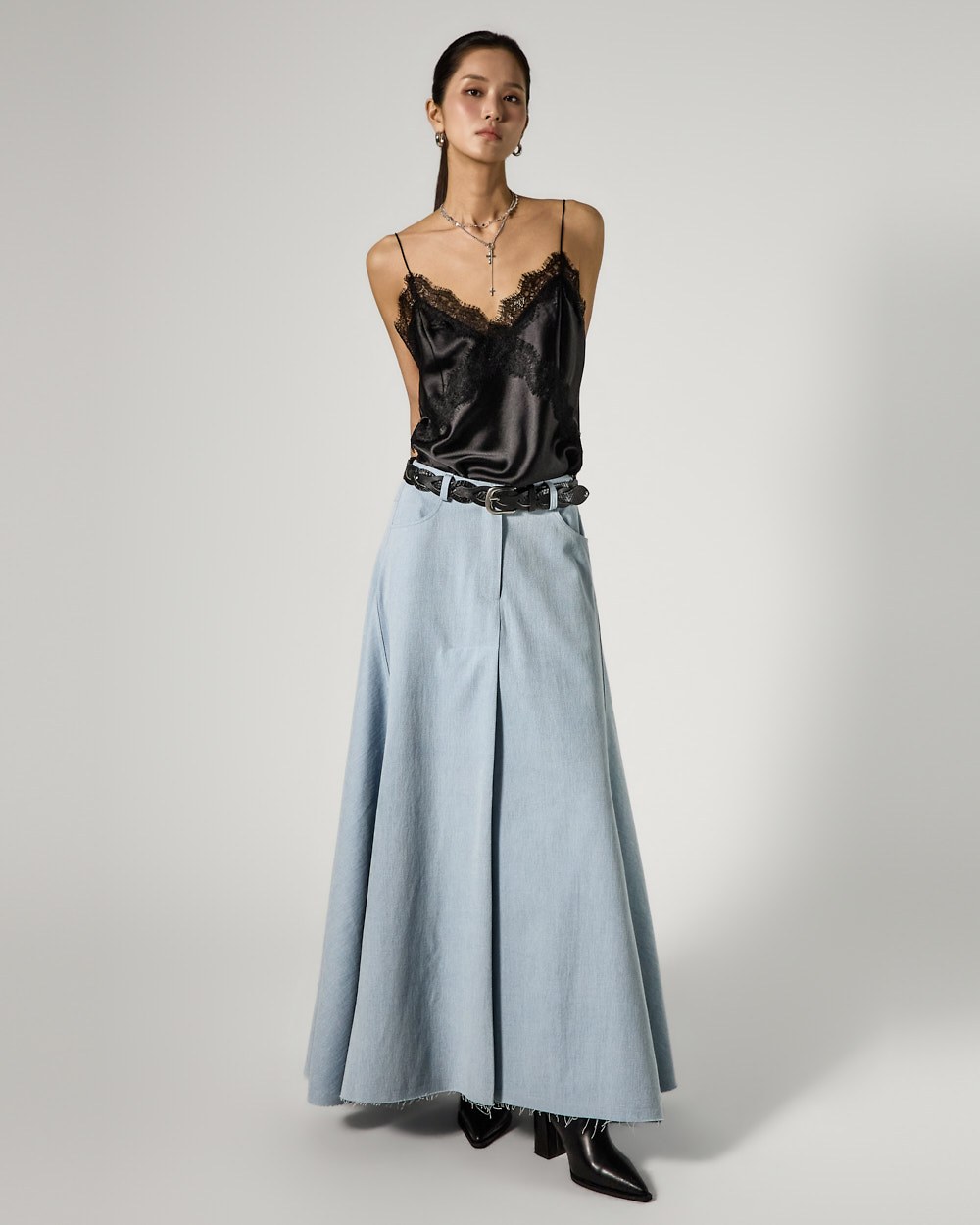 캐주얼하면서 미니멀한 무드의 데님 맥시 스커트입니다.