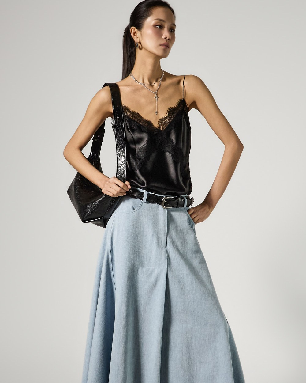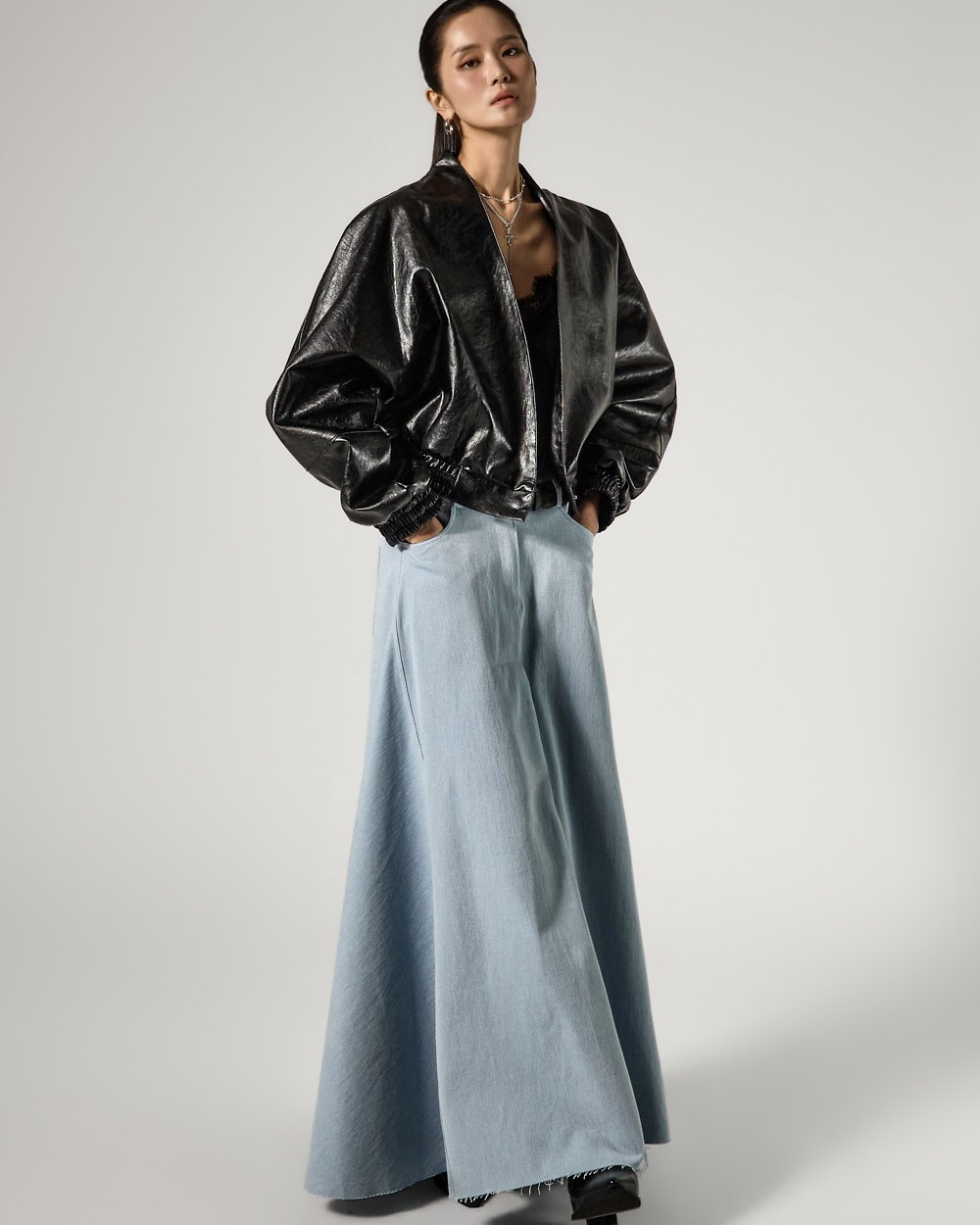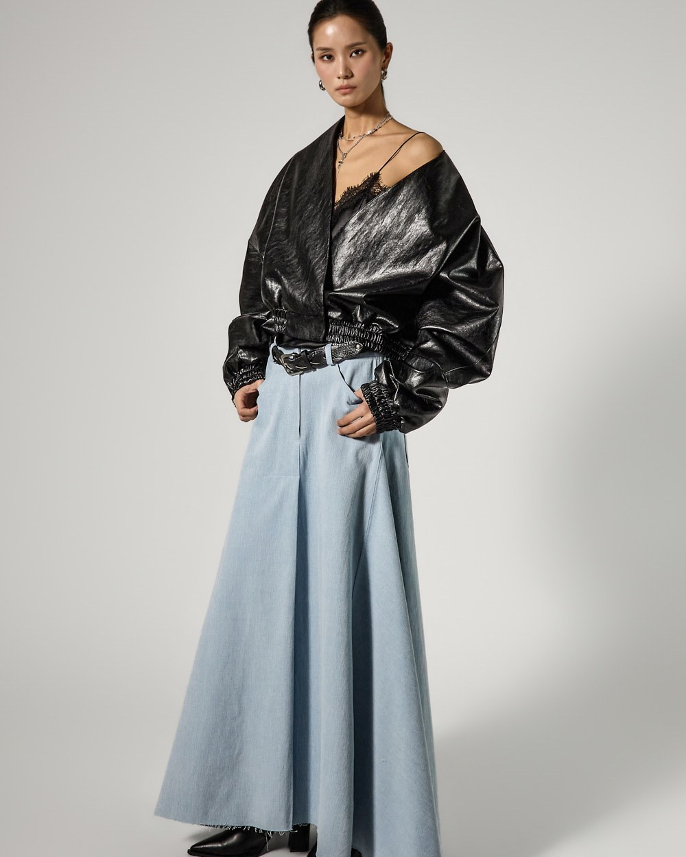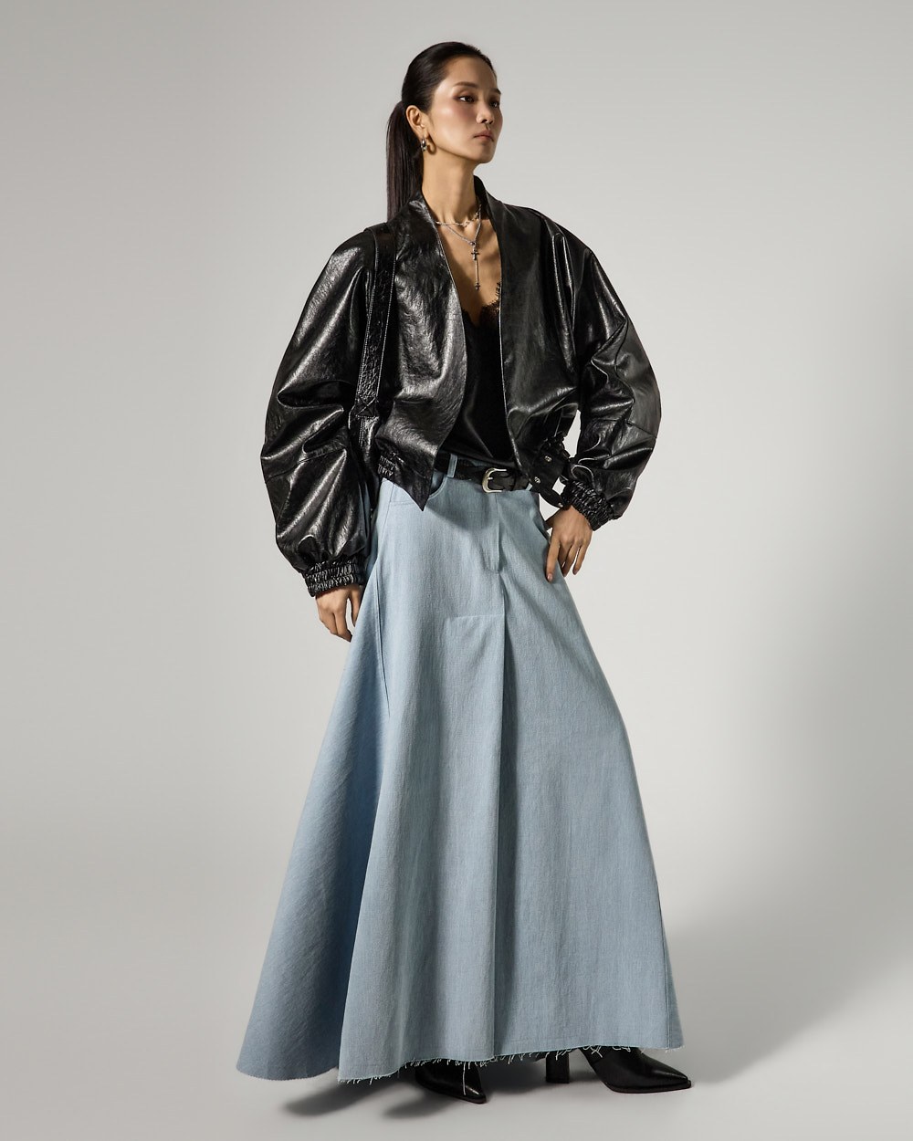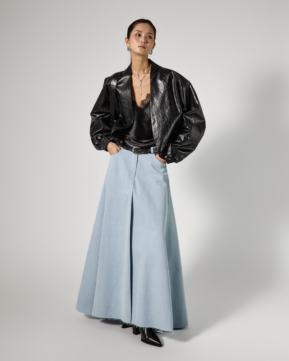 캐주얼하면서 미니멀한 무드의 데님 맥시 스커트입니다.