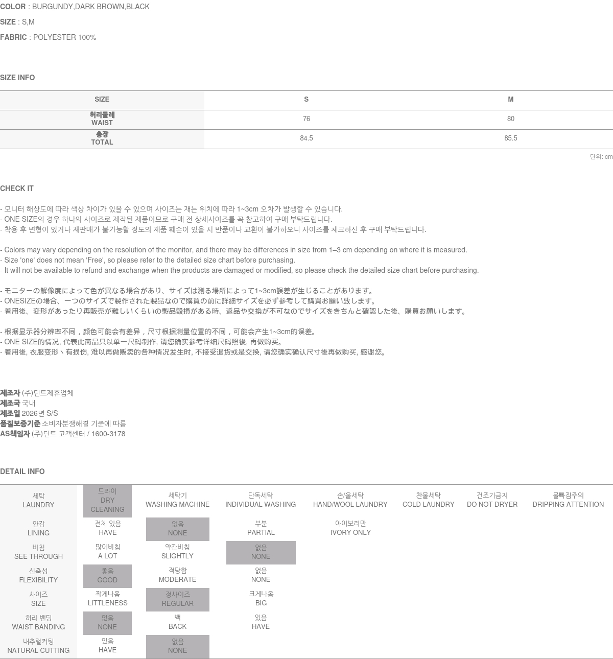 - (주)딘트의 의류는 일반 세탁 및 건조기 사용 시 원단의 변형이나 제품 손상의 원인이 될 수 있으므로, 하단에 안내된 세탁 방법을 따라주시기를 권장합니다.