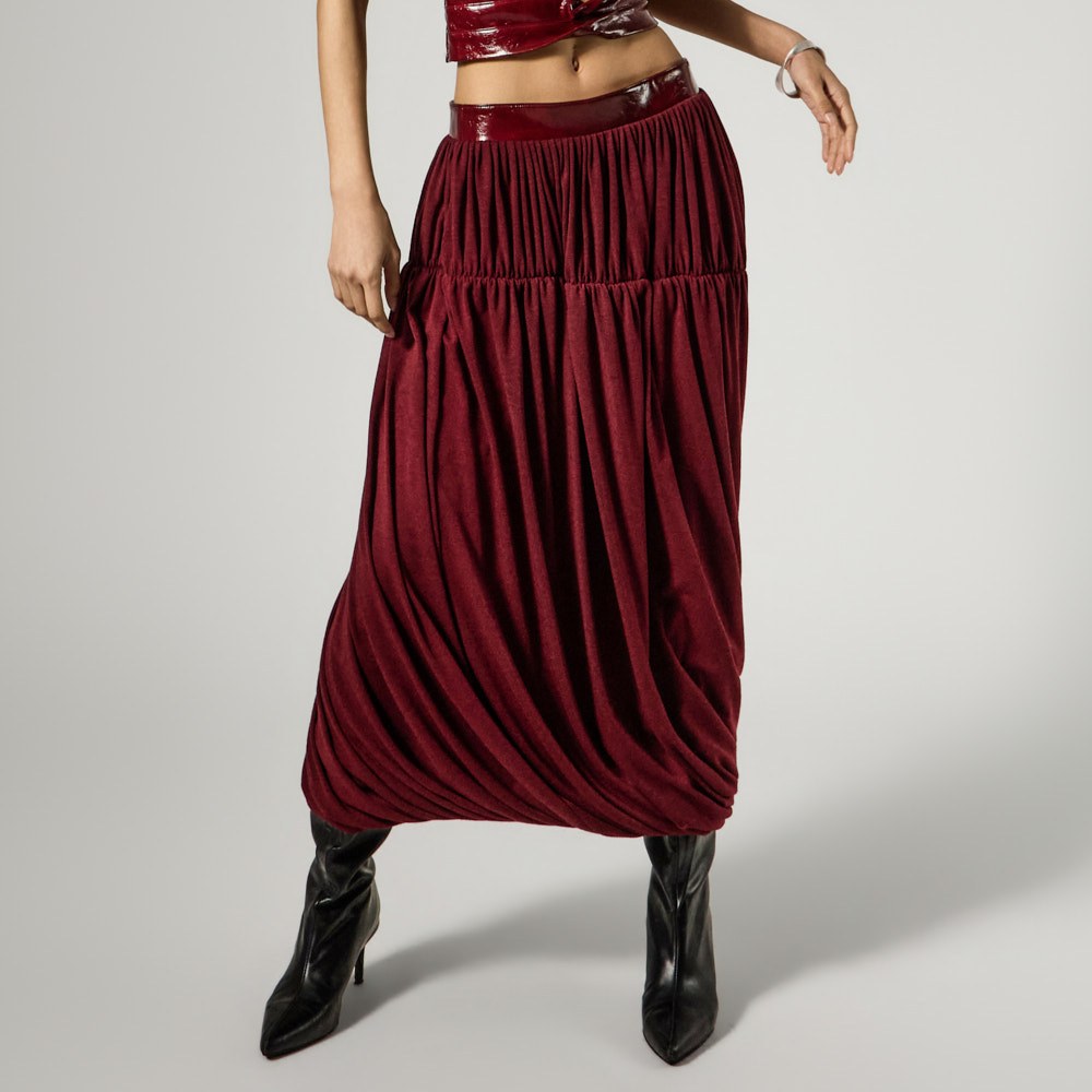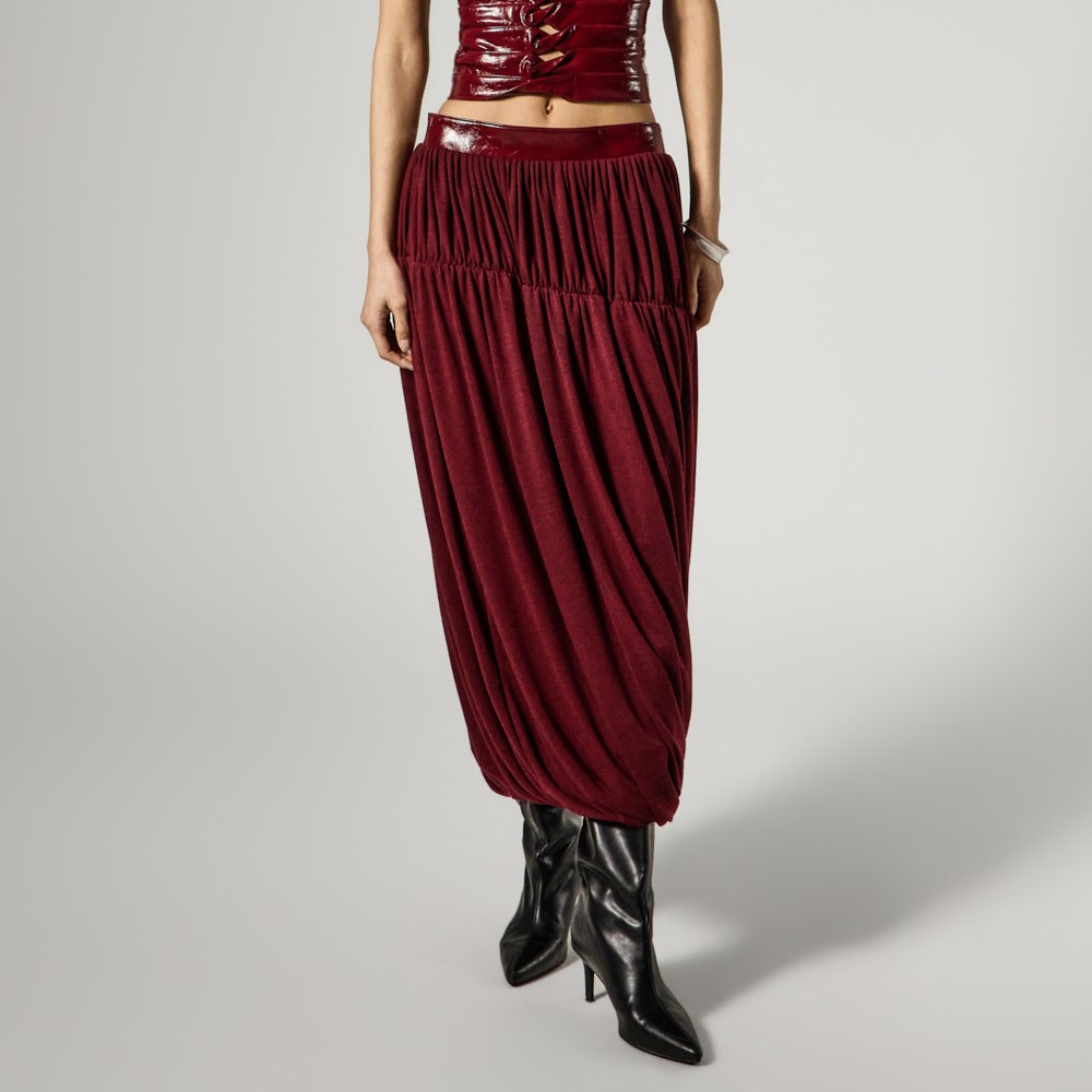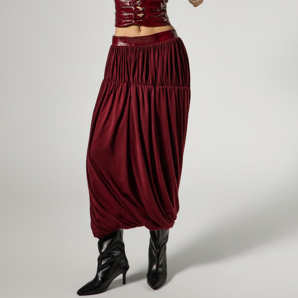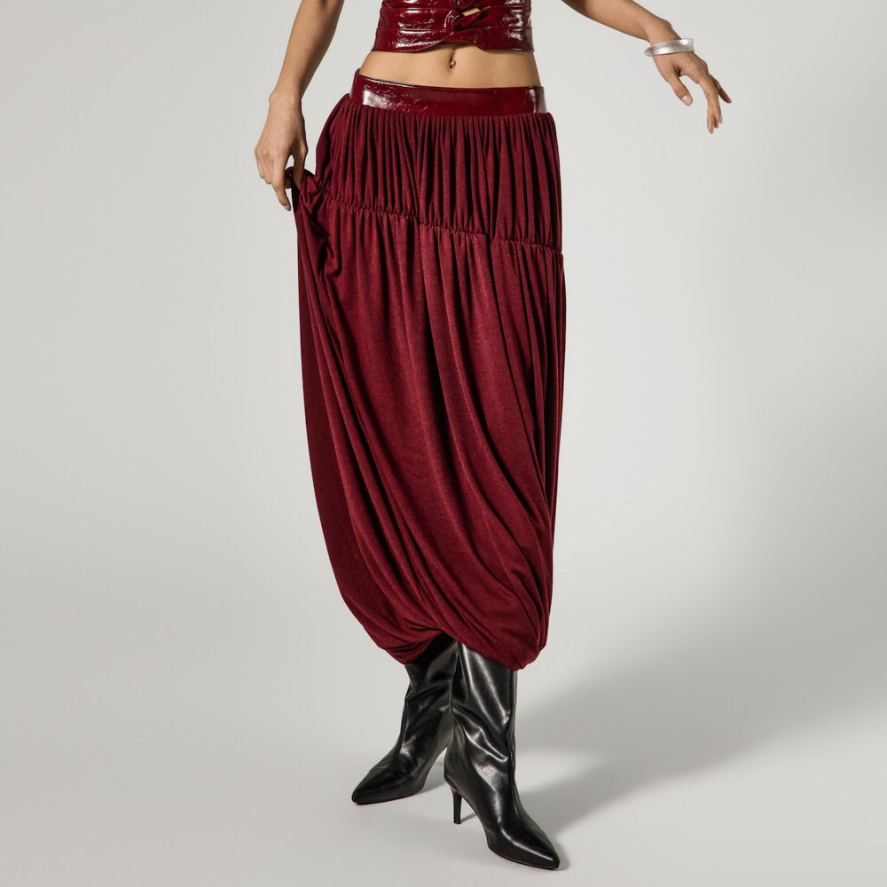 풍성하게 떨어지는 벌룬 롱 스커트 실루엣으로