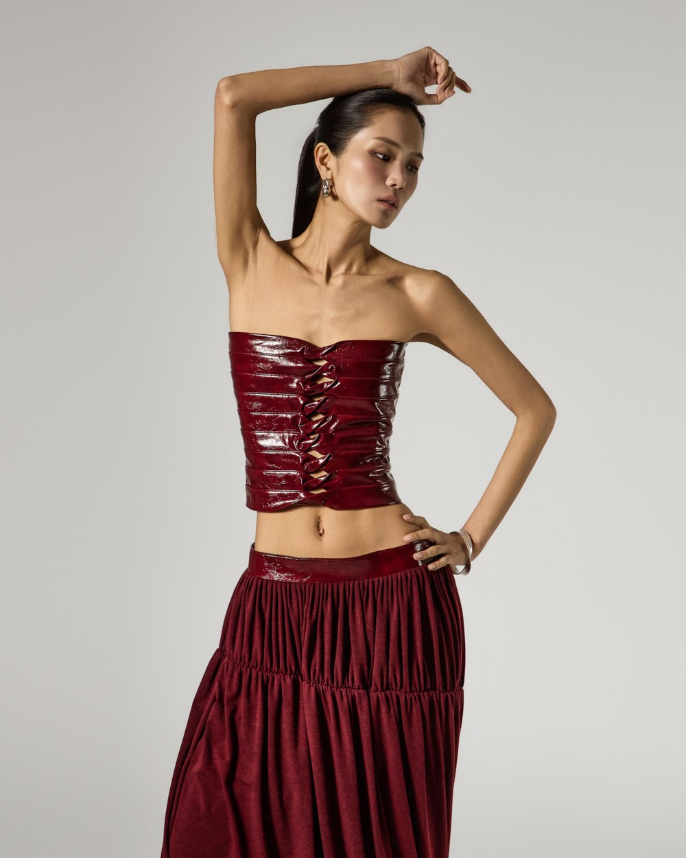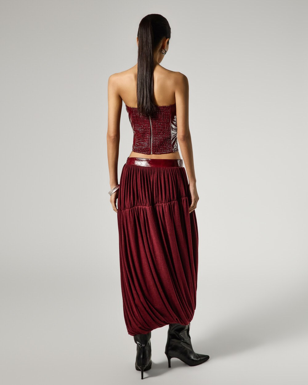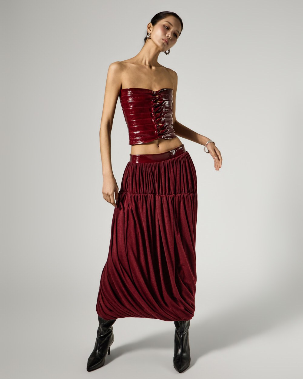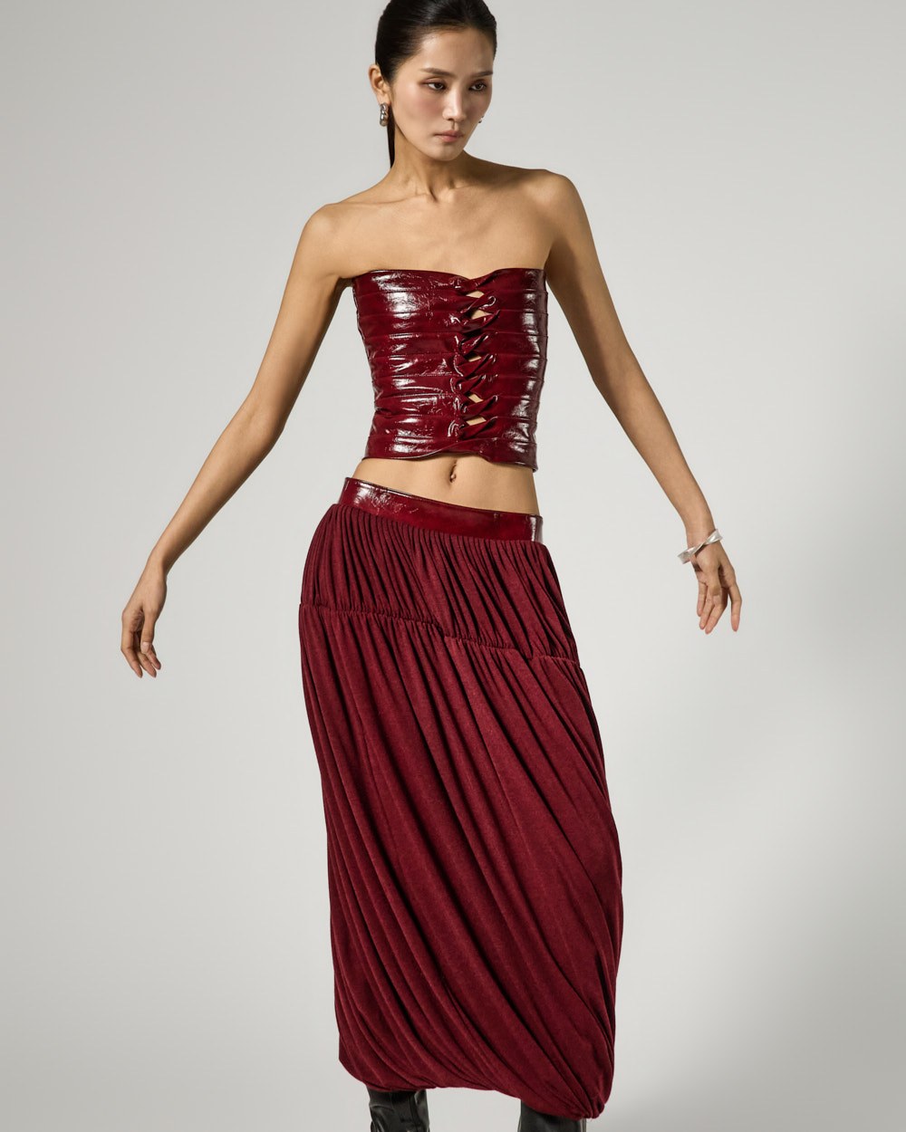 풍성하게 떨어지는 벌룬 롱 스커트 실루엣으로