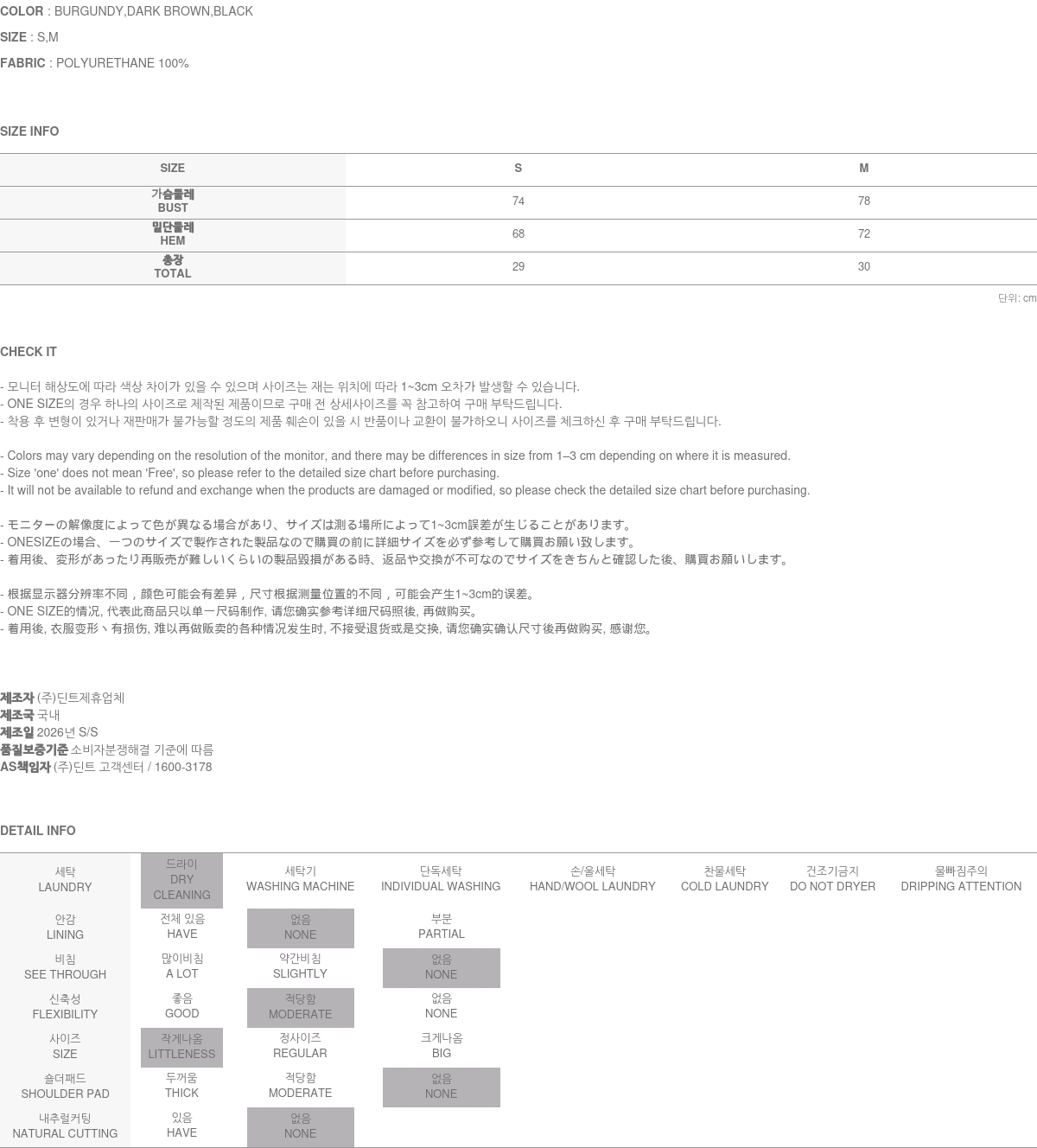 - (주)딘트의 의류는 일반 세탁 및 건조기 사용 시 원단의 변형이나 제품 손상의 원인이 될 수 있으므로, 하단에 안내된 세탁 방법을 따라주시기를 권장합니다.