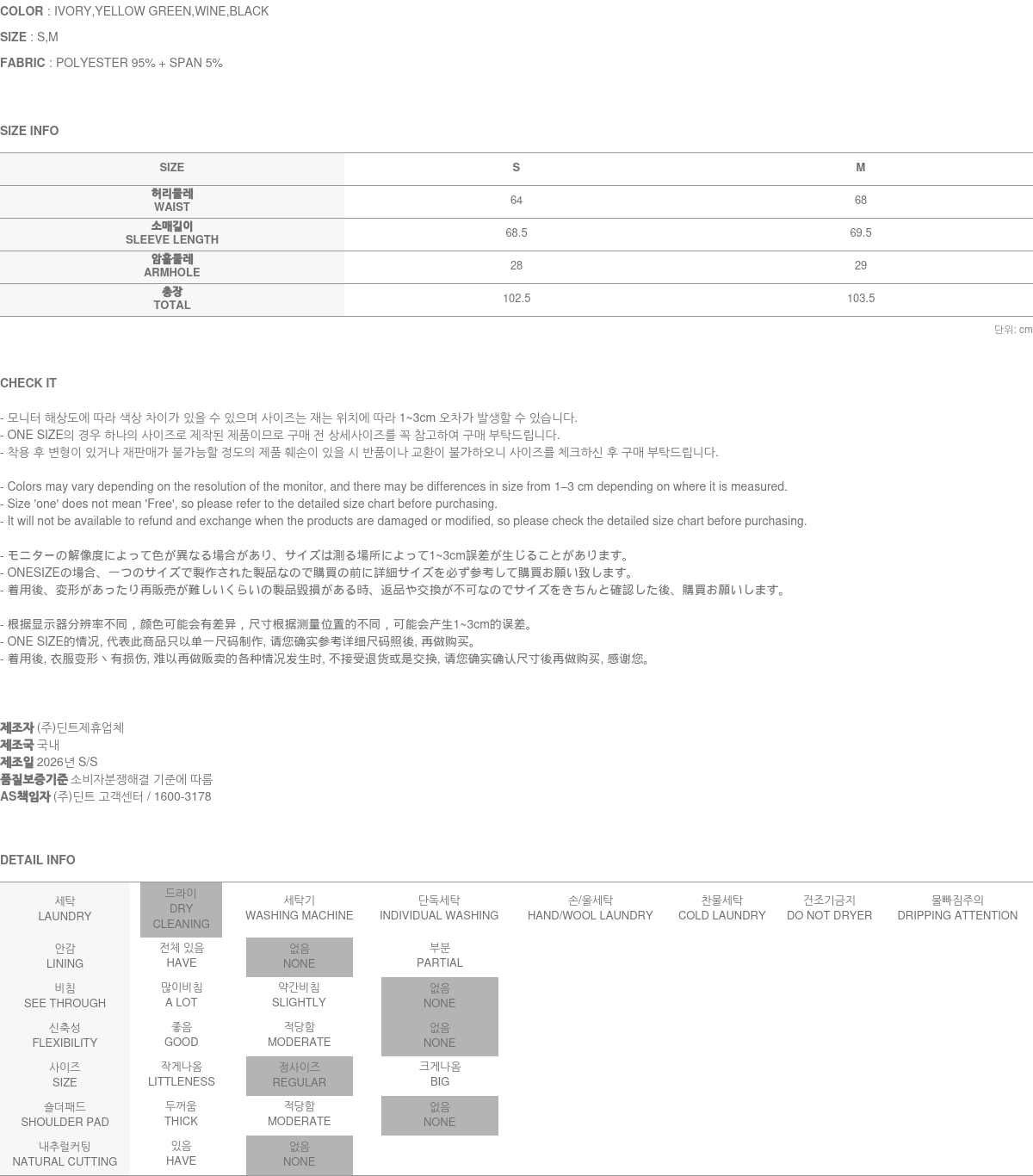 - (주)딘트의 의류는 일반 세탁 및 건조기 사용 시 원단의 변형이나 제품 손상의 원인이 될 수 있으므로, 하단에 안내된 세탁 방법을 따라주시기를 권장합니다.