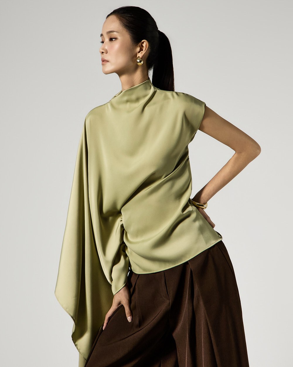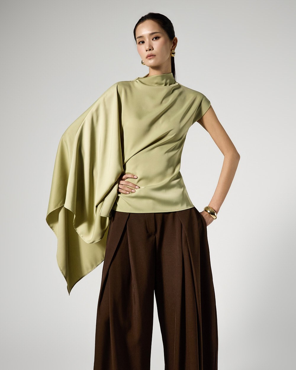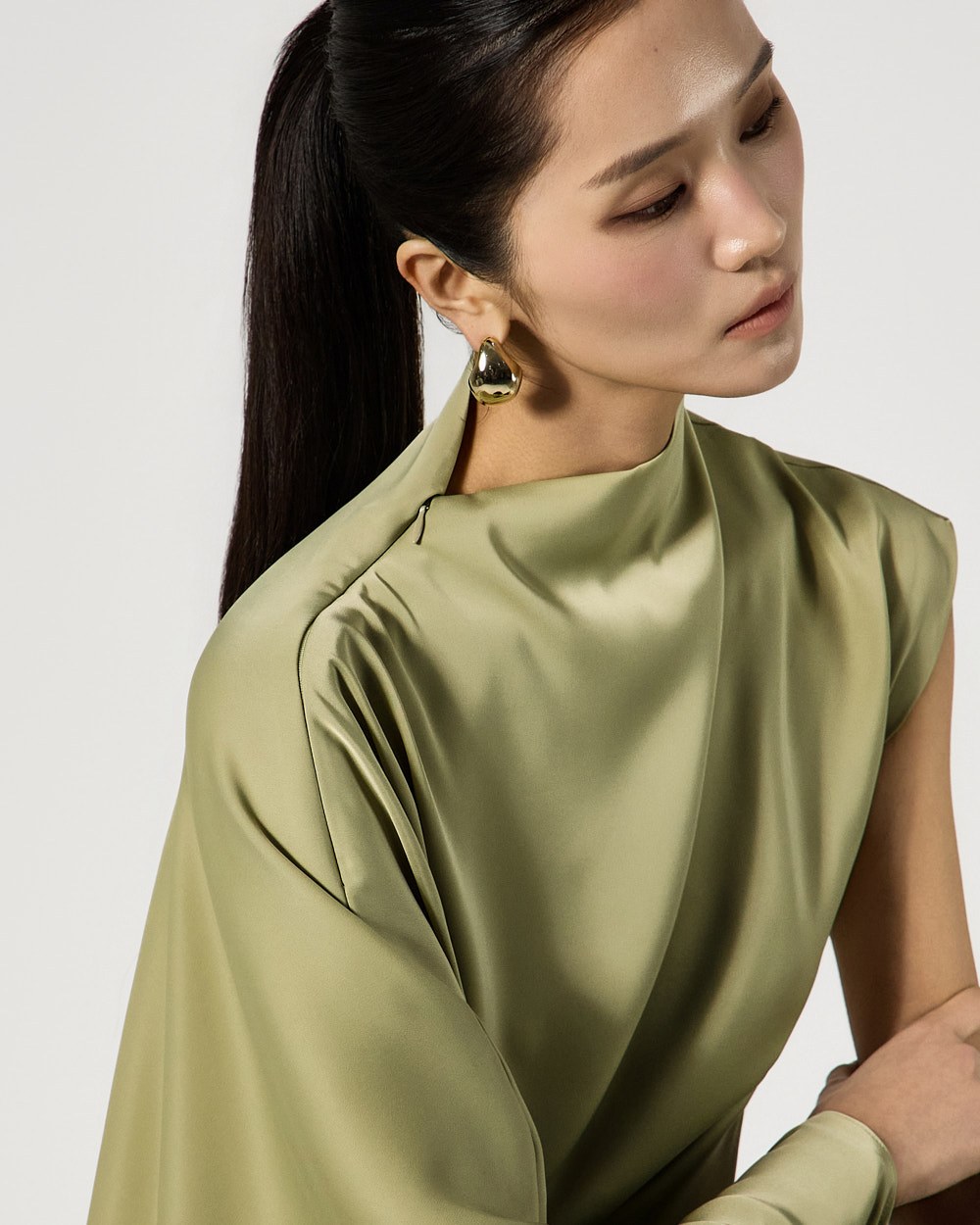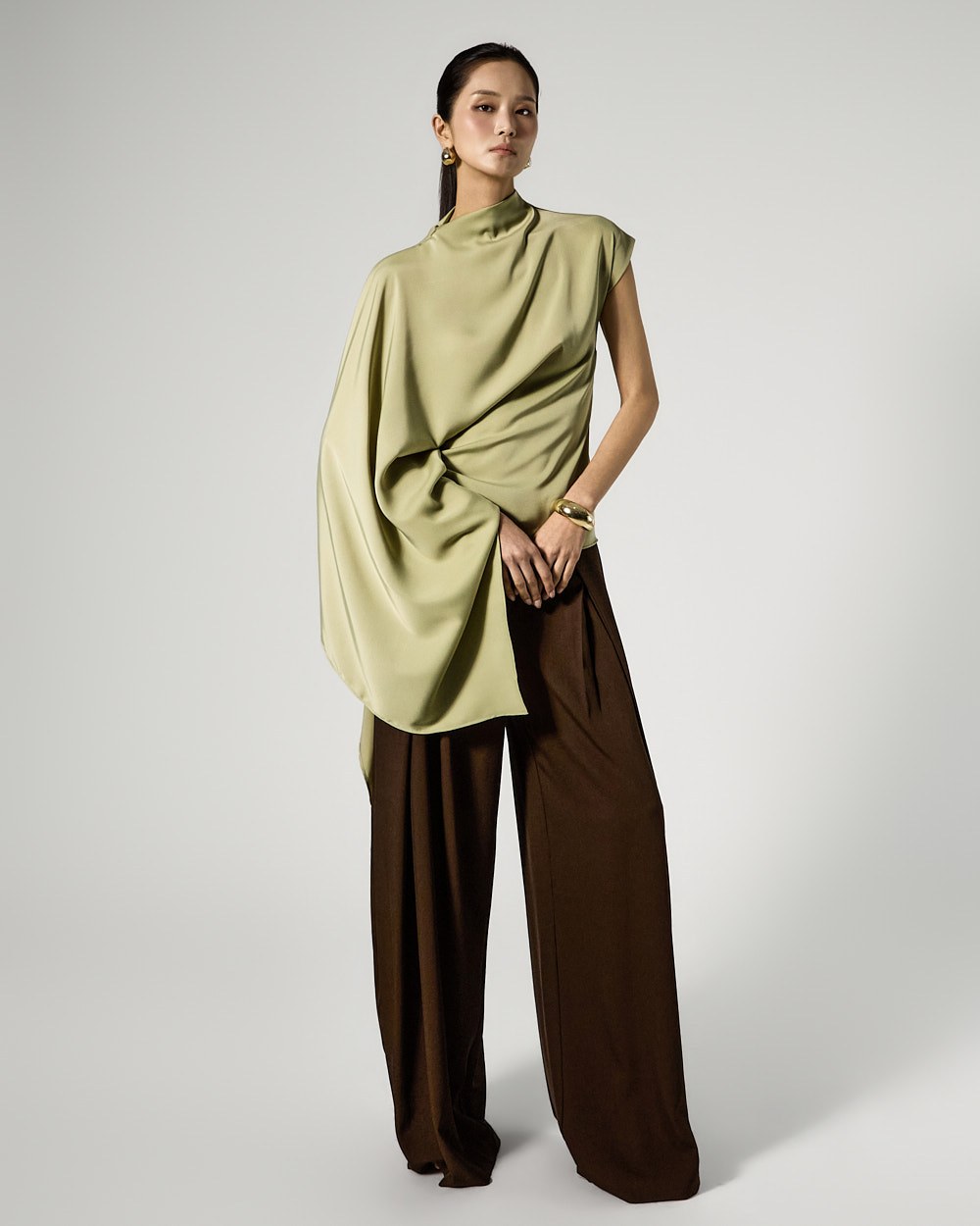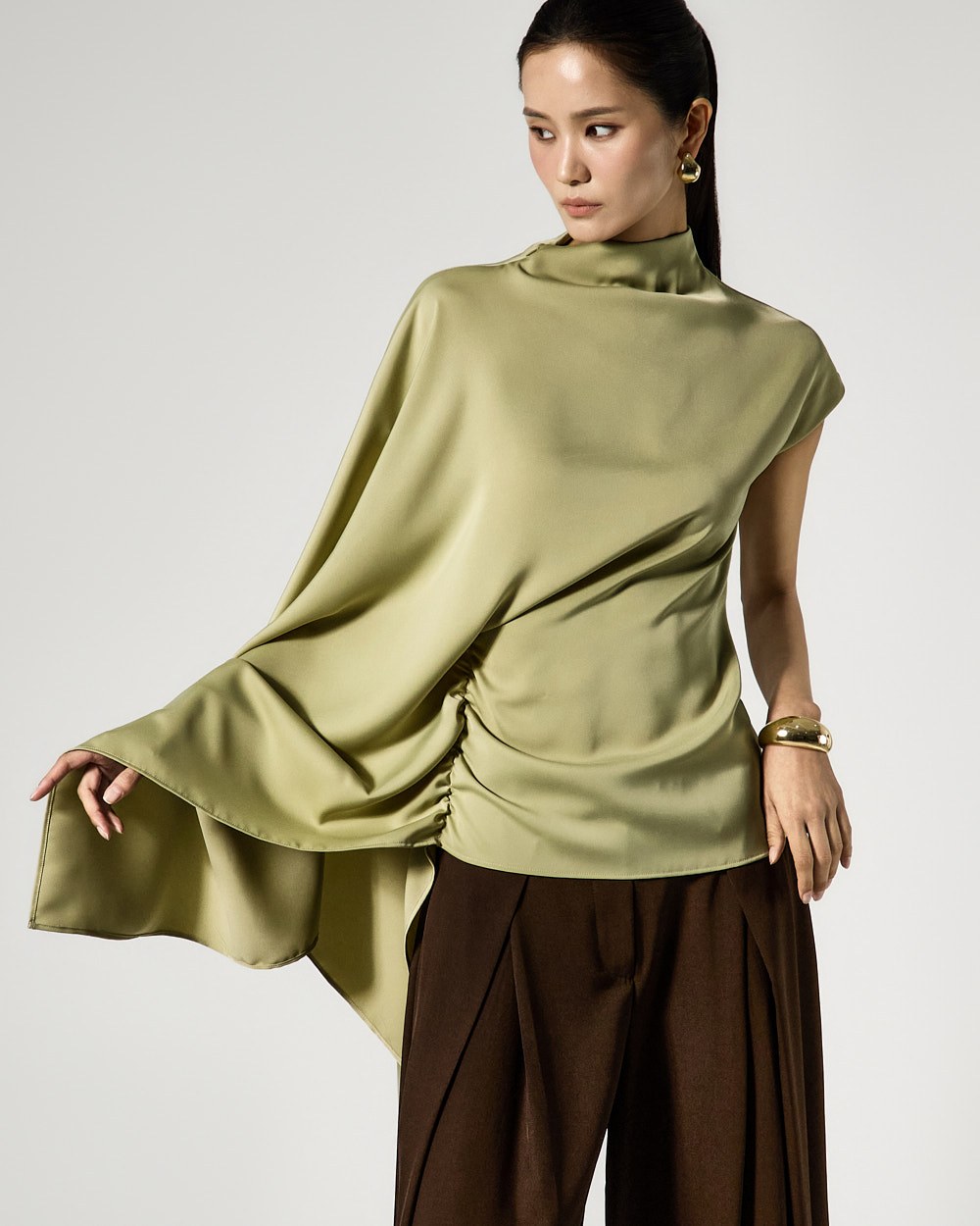 사이드 셔링 드레이프 디테일로 입체적인 실루엣을 완성하고