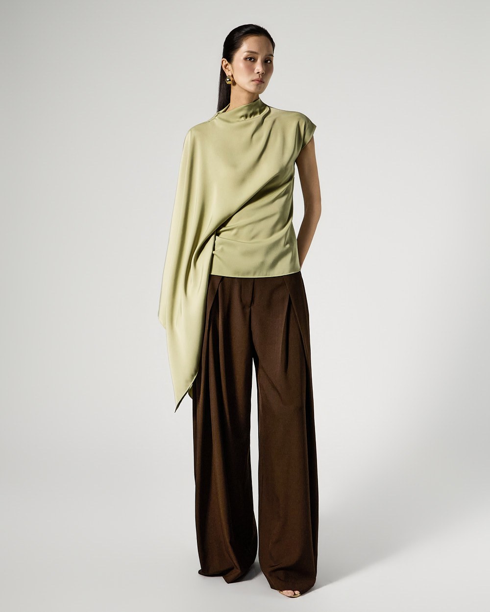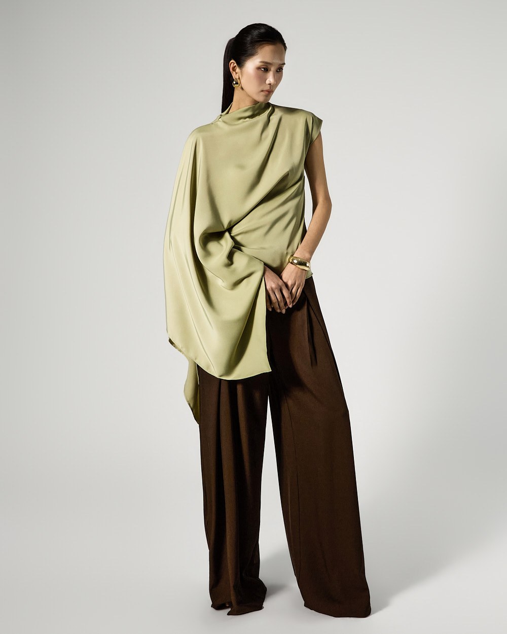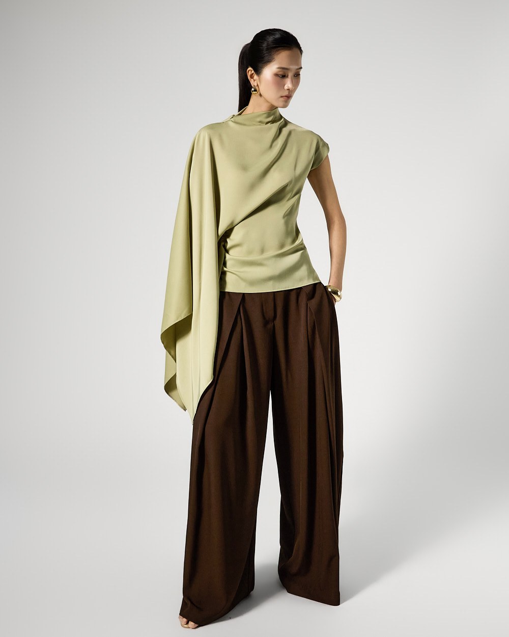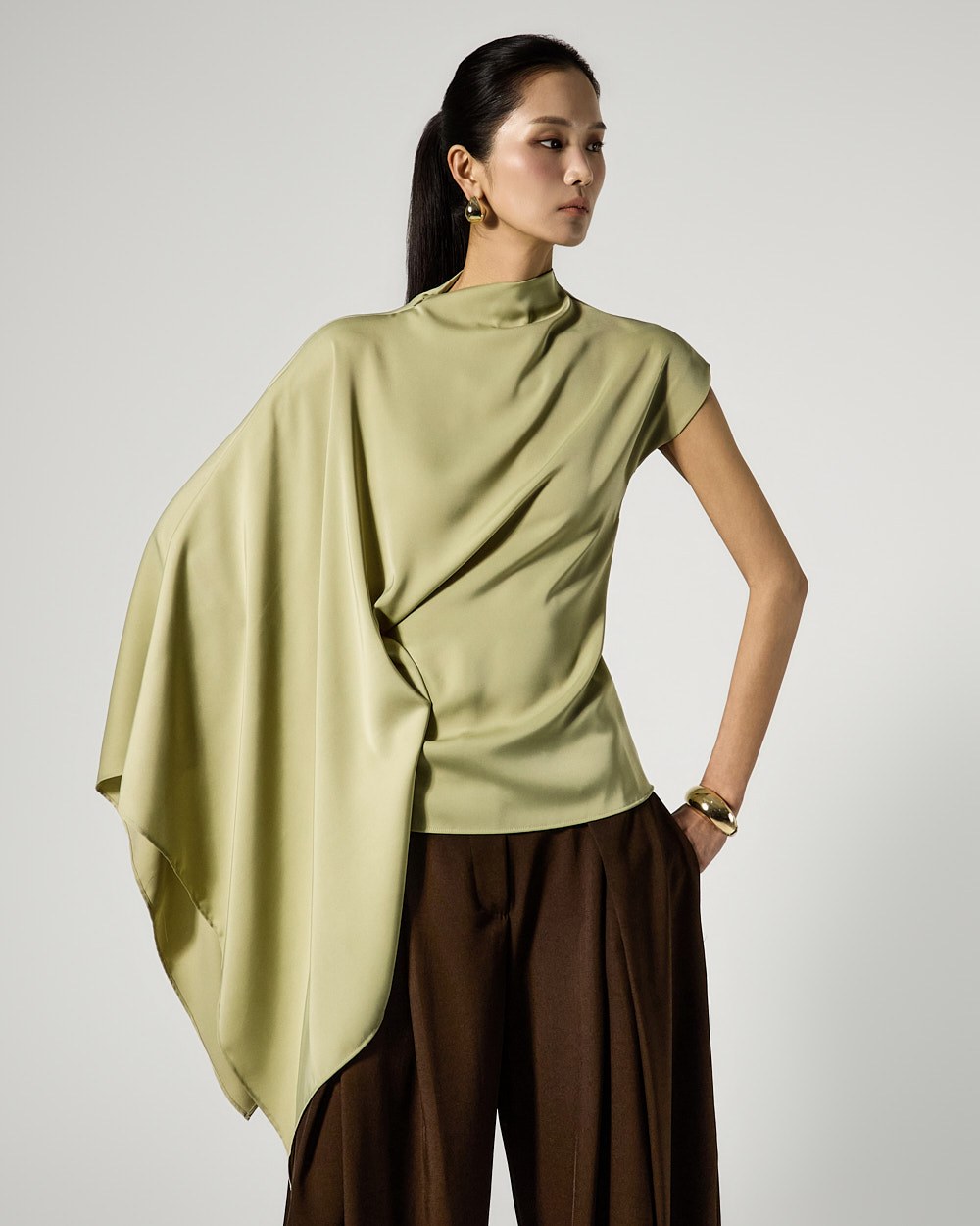 사이드 셔링 드레이프 디테일로 입체적인 실루엣을 완성하고