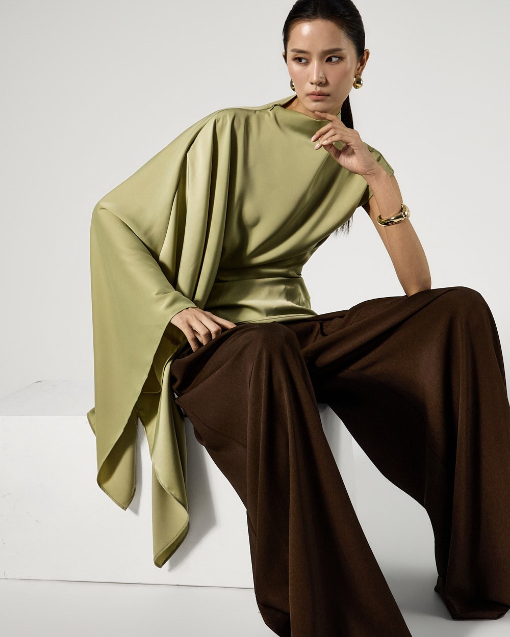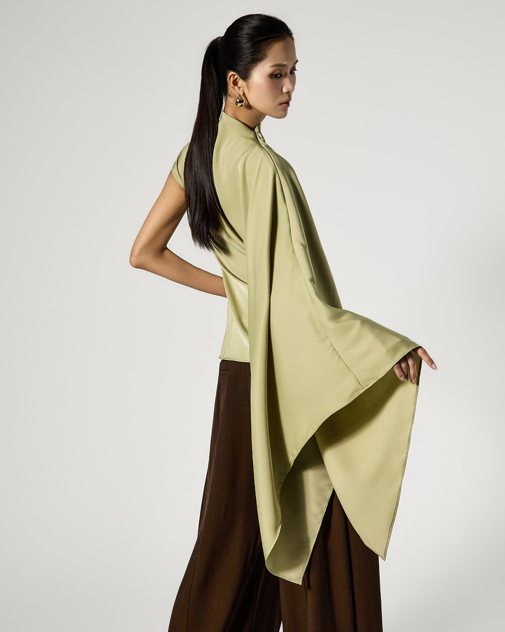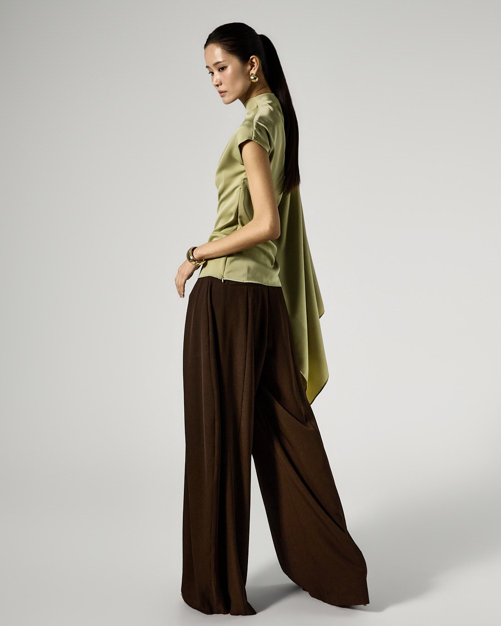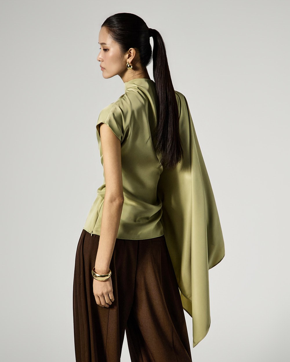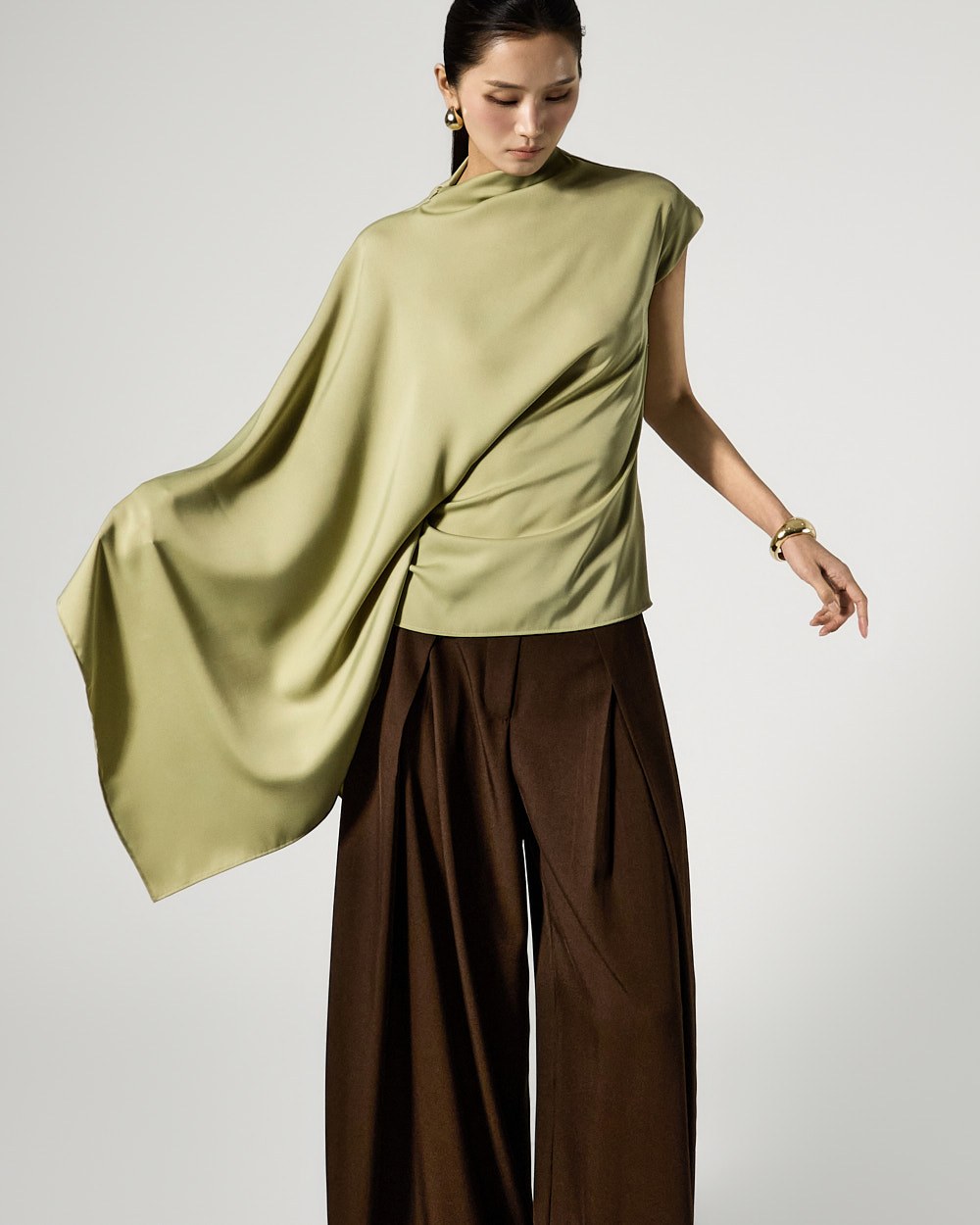 사이드 셔링 드레이프 디테일로 입체적인 실루엣을 완성하고
