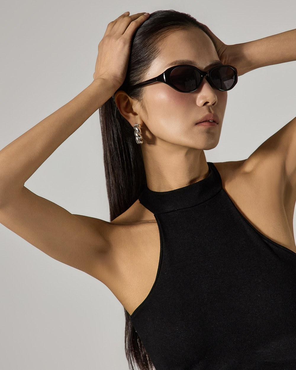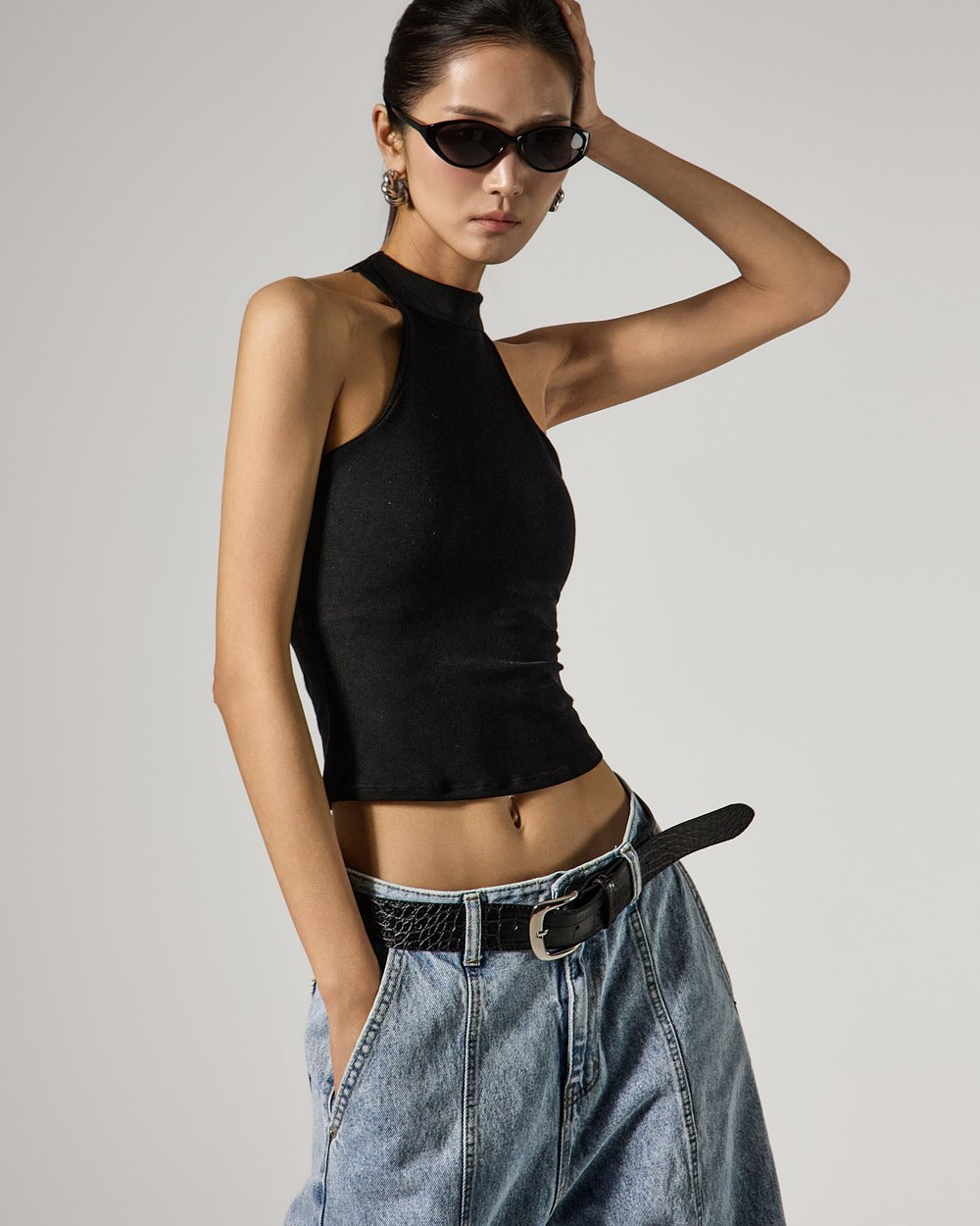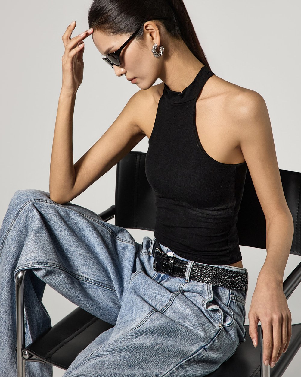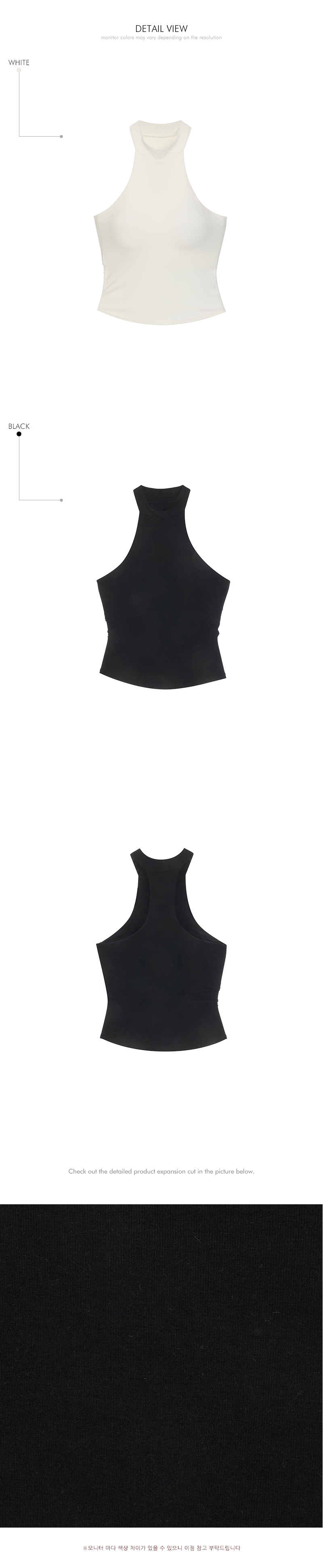 하이넥 홀터 디자인으로 세련된 분위기를 연출하며,