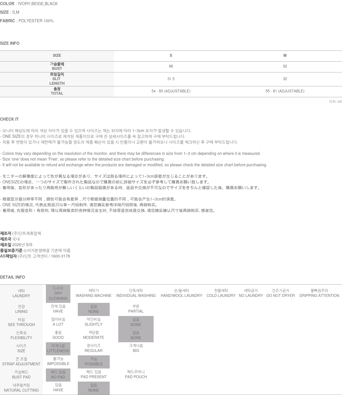 - (주)딘트의 의류는 일반 세탁 및 건조기 사용 시 원단의 변형이나 제품 손상의 원인이 될 수 있으므로, 하단에 안내된 세탁 방법을 따라주시기를 권장합니다.