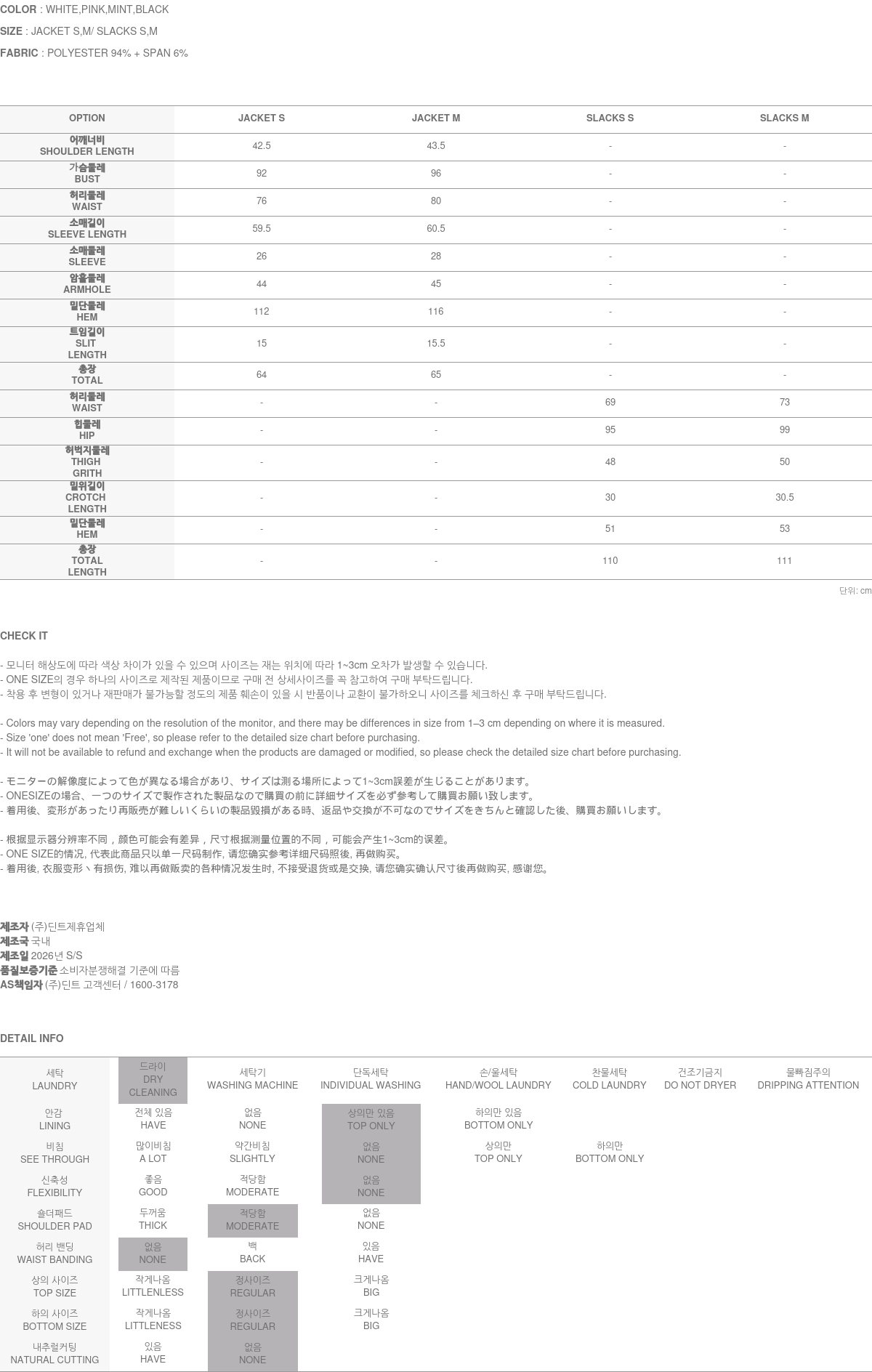 POLYESTER 94% + SPAN 6% 소재로 제작되어