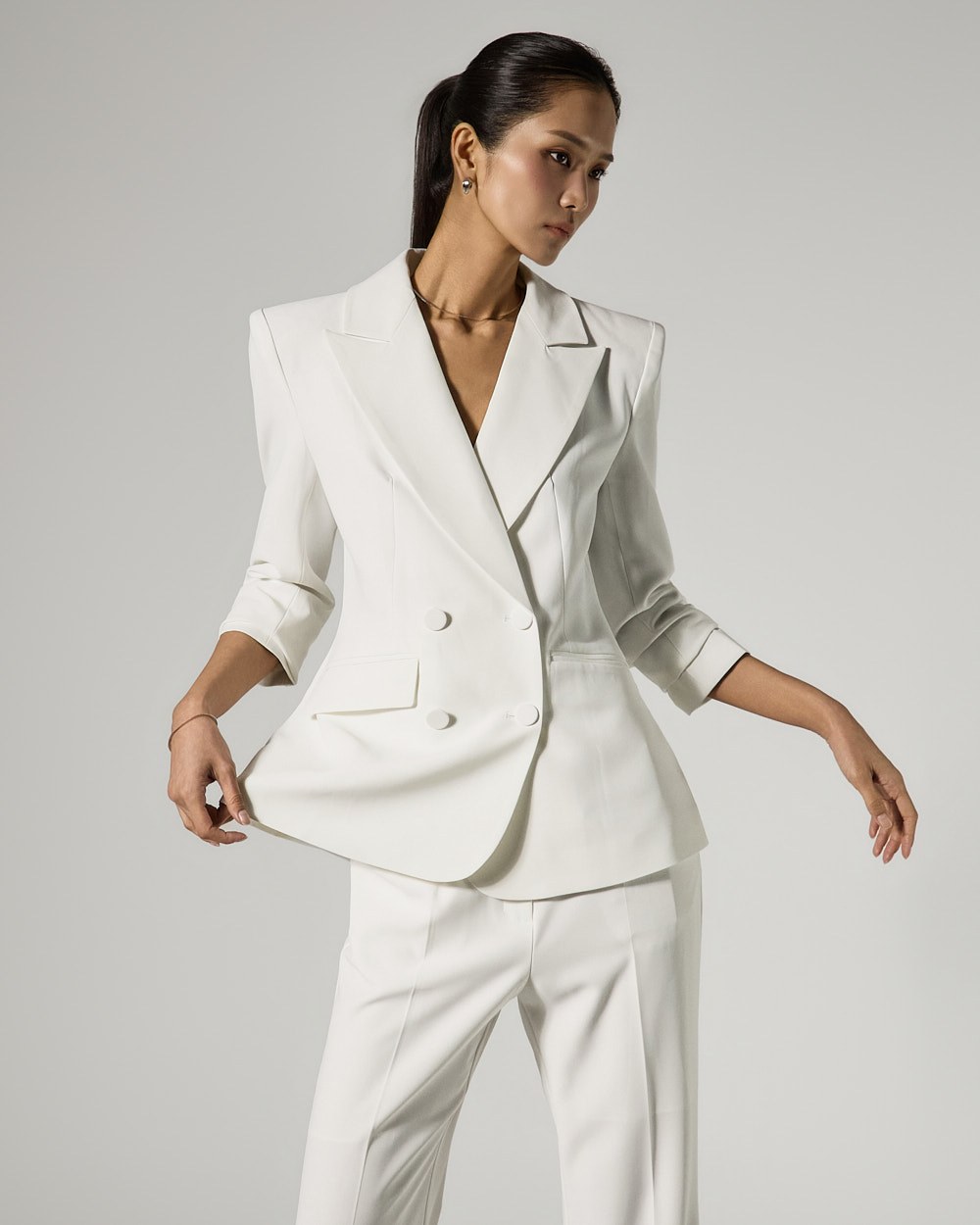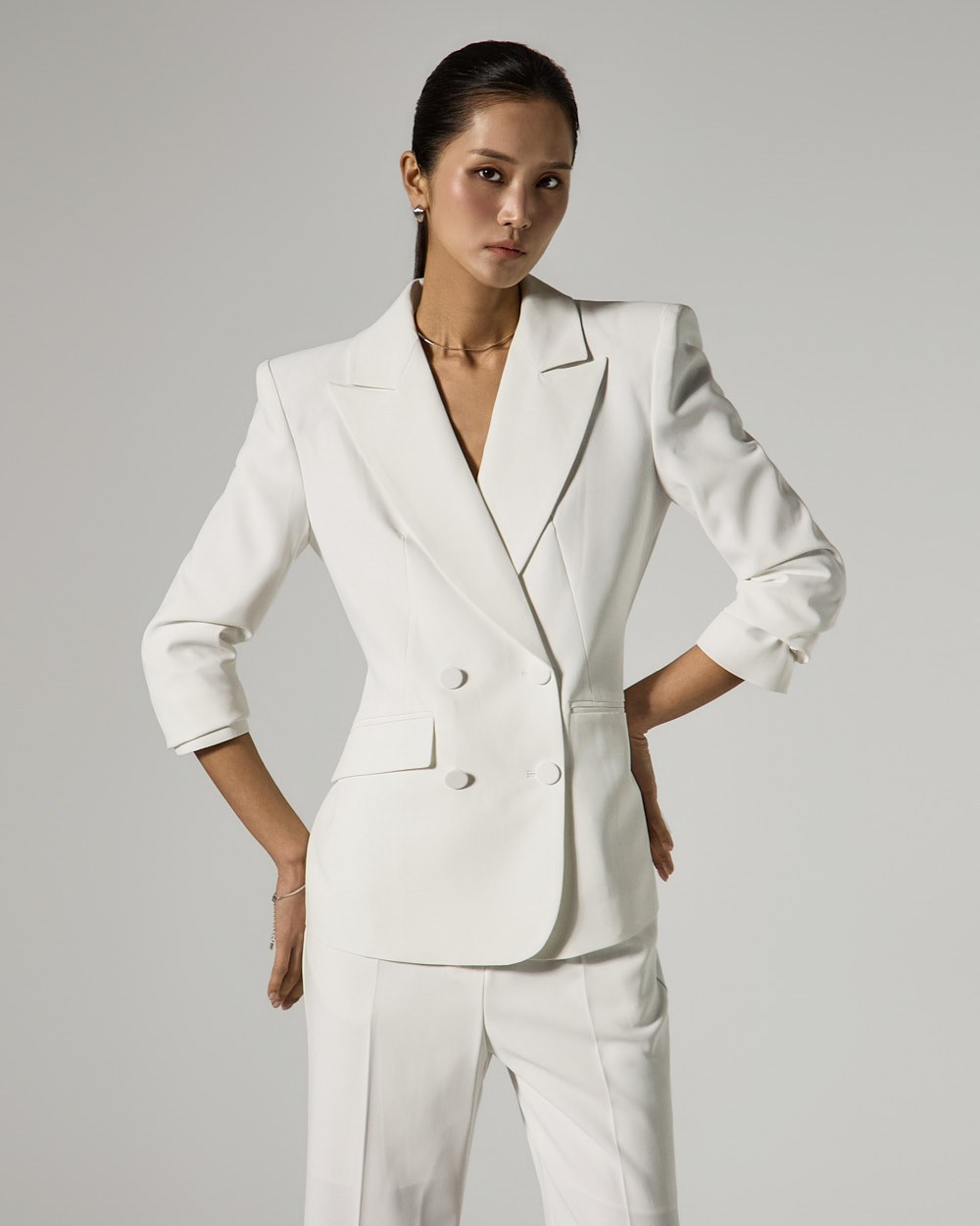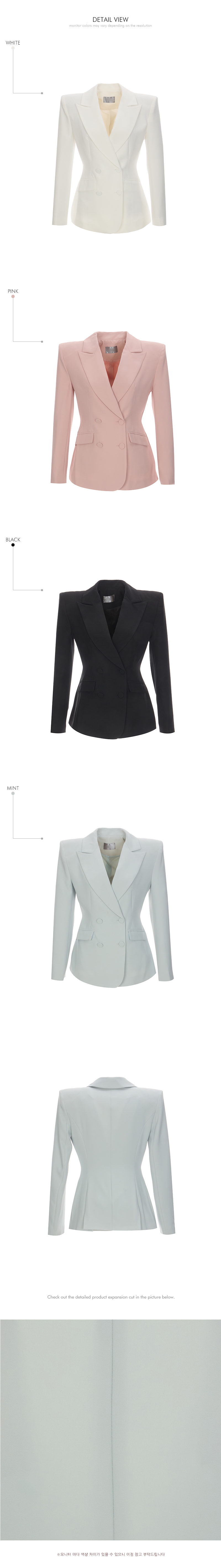 자켓은 4 더블 버튼 디테일로 클래식한 포인트를 더했으며,