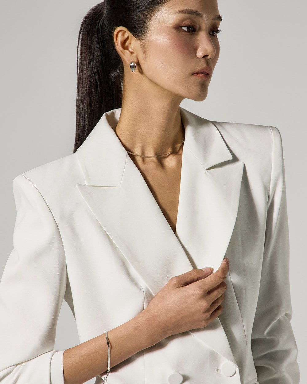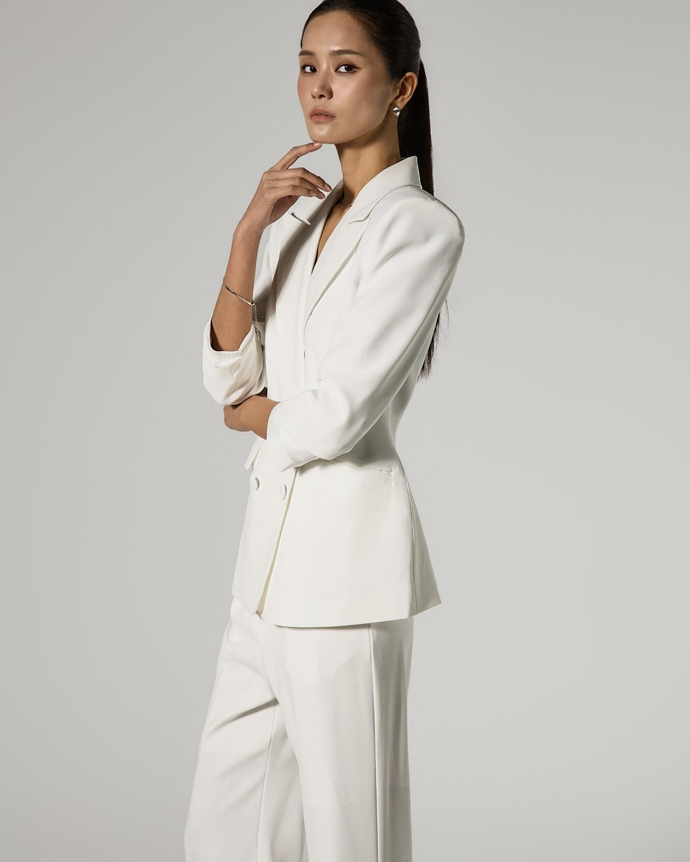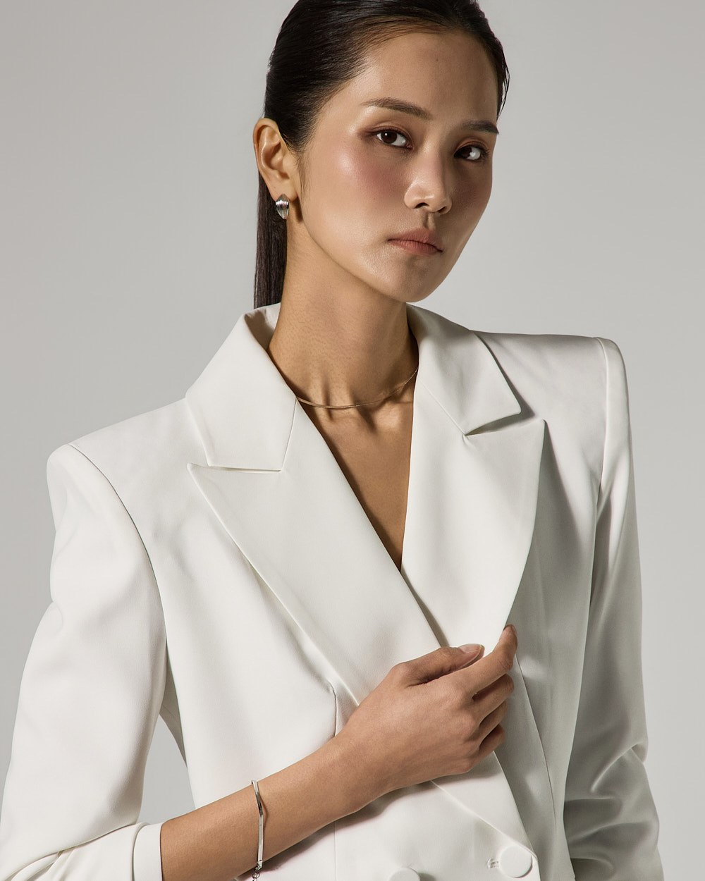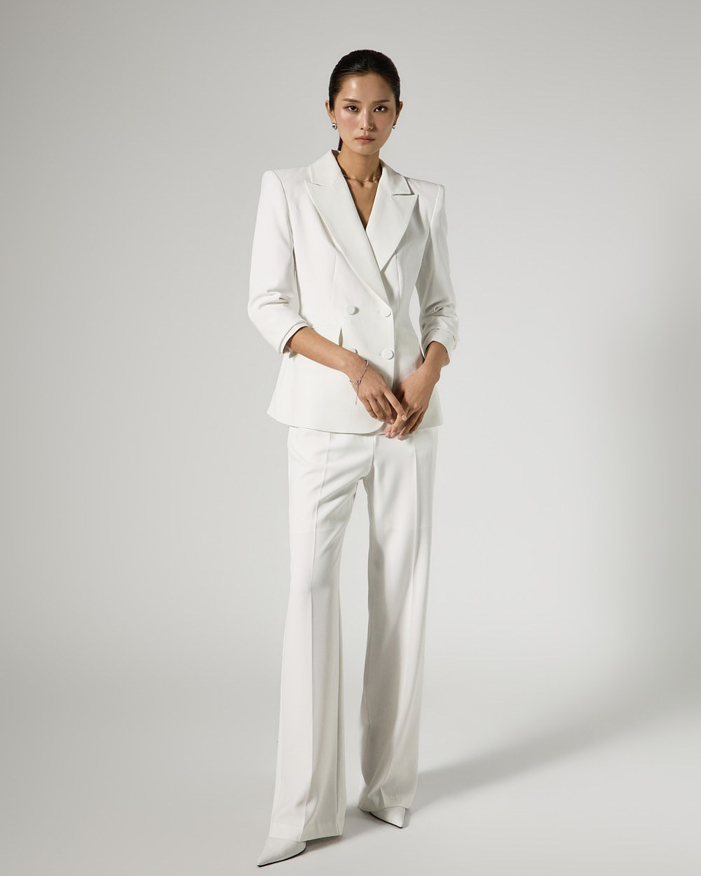 자켓은 4 더블 버튼 디테일로 클래식한 포인트를 더했으며,