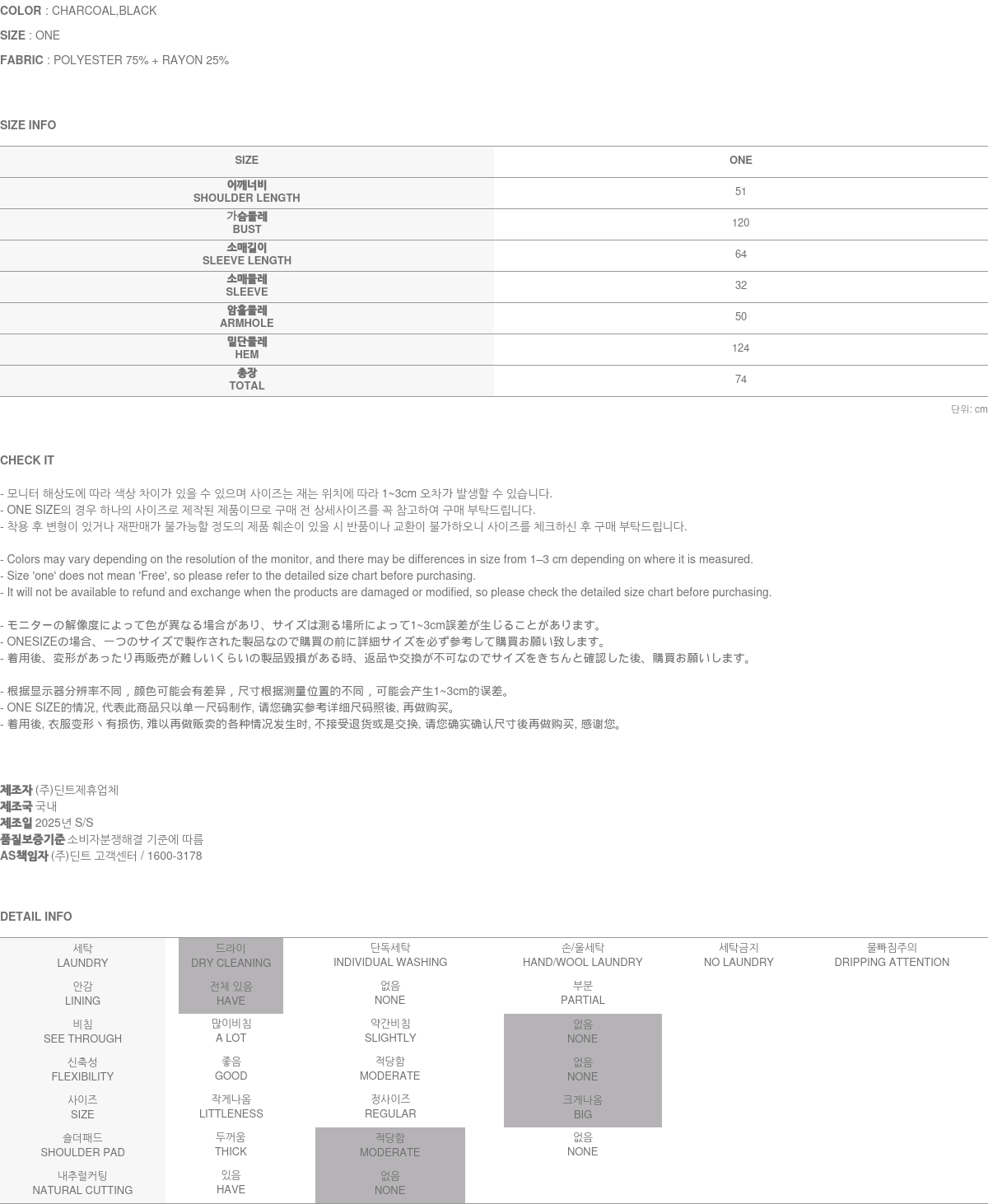 171CM 모델 ONE 사이즈, CHARCOAL 컬러 착용하였습니다.