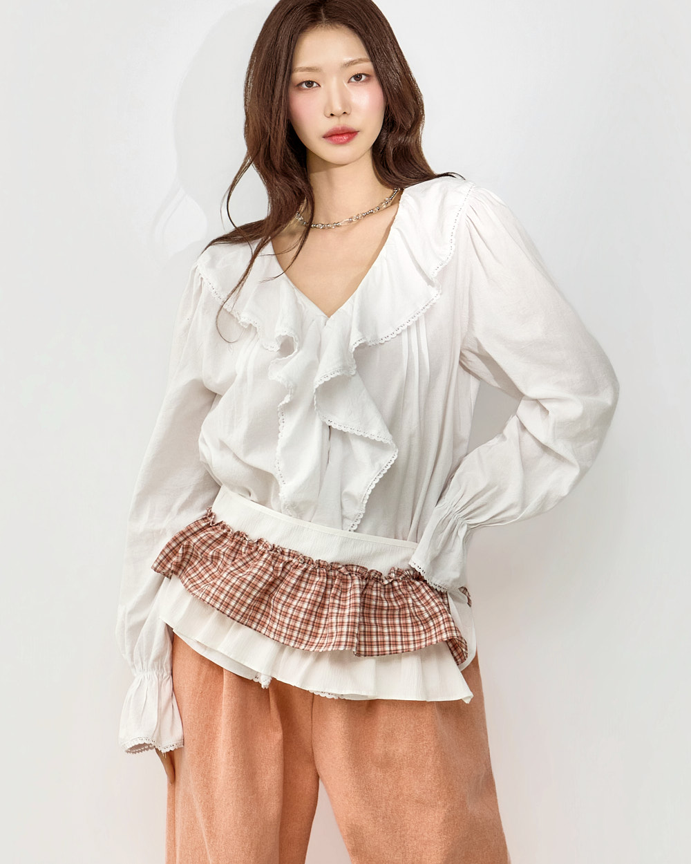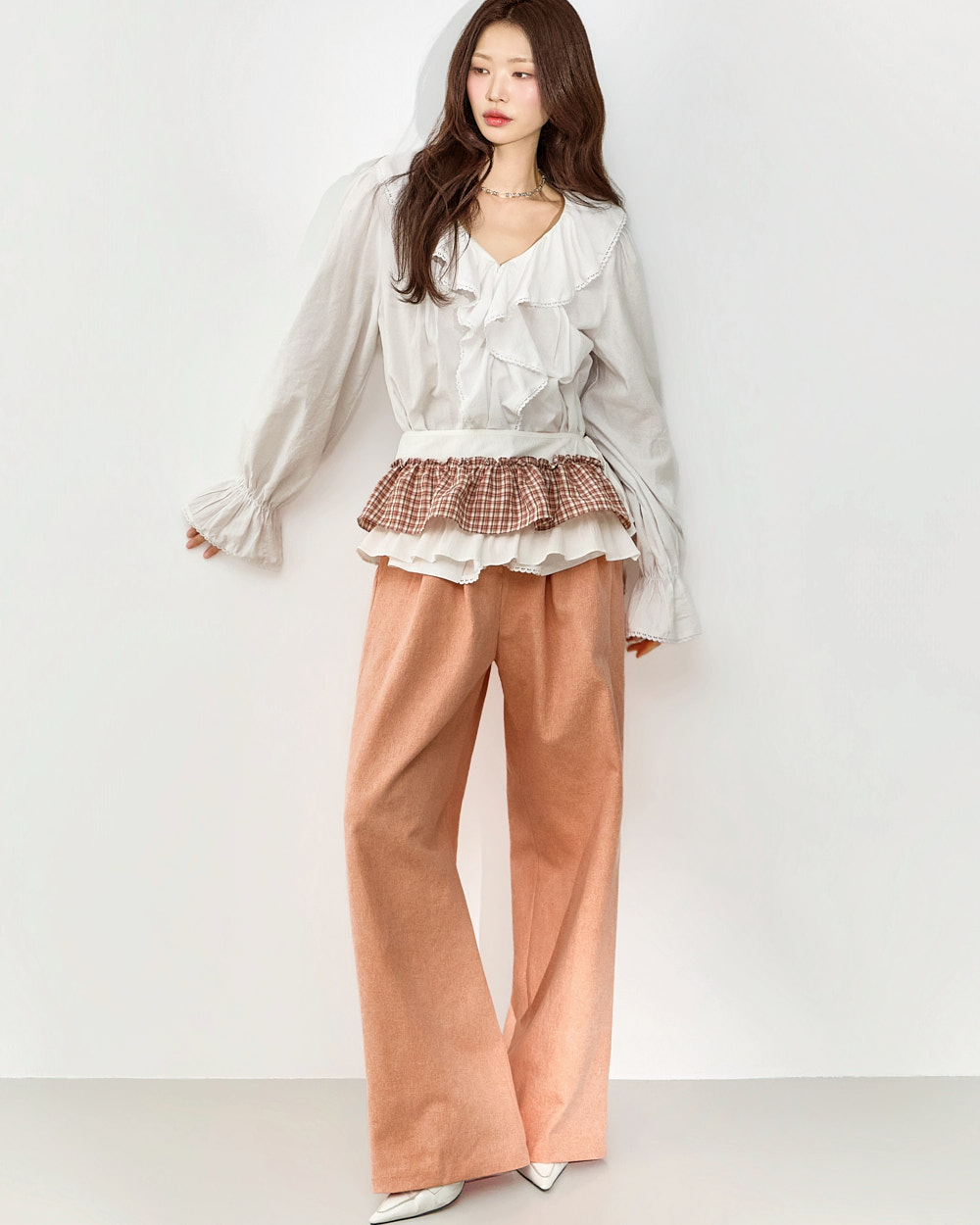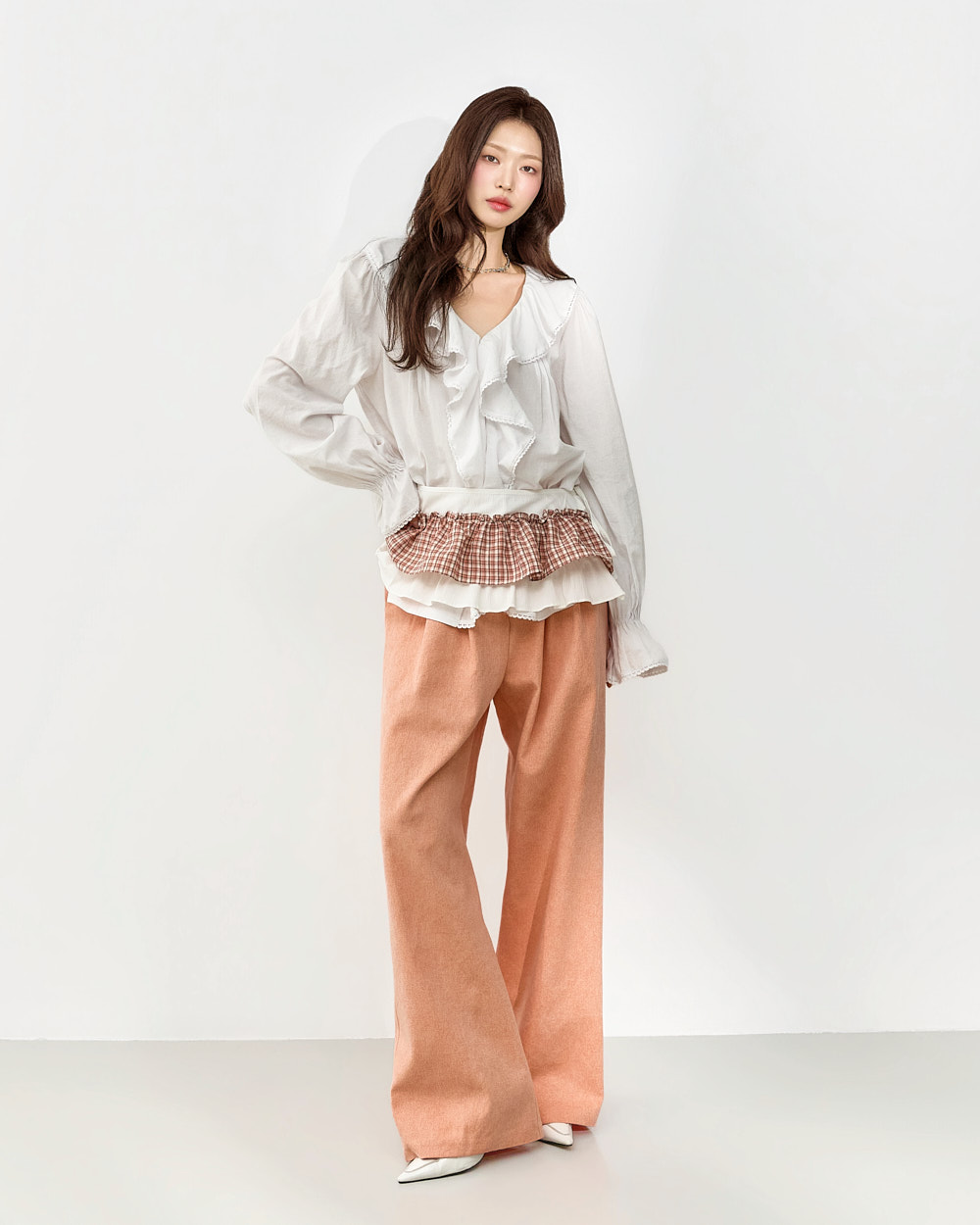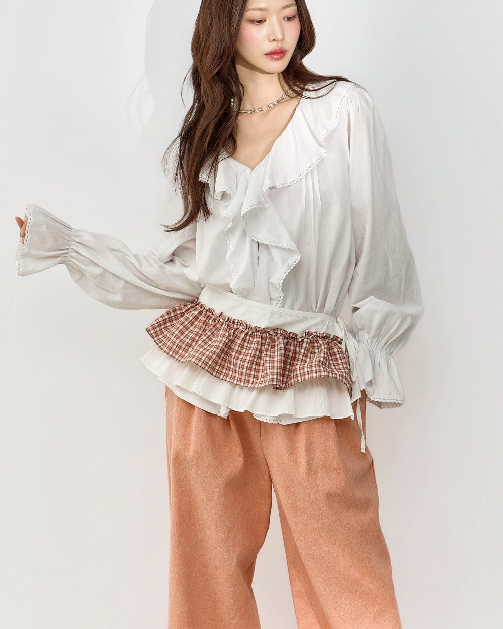 네크라인부터 자연스럽게 이어지는 프릴 디테일로