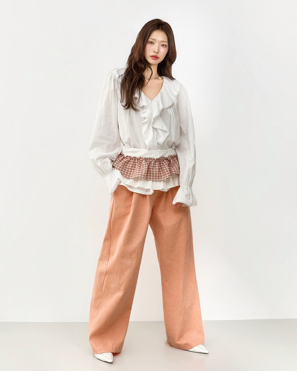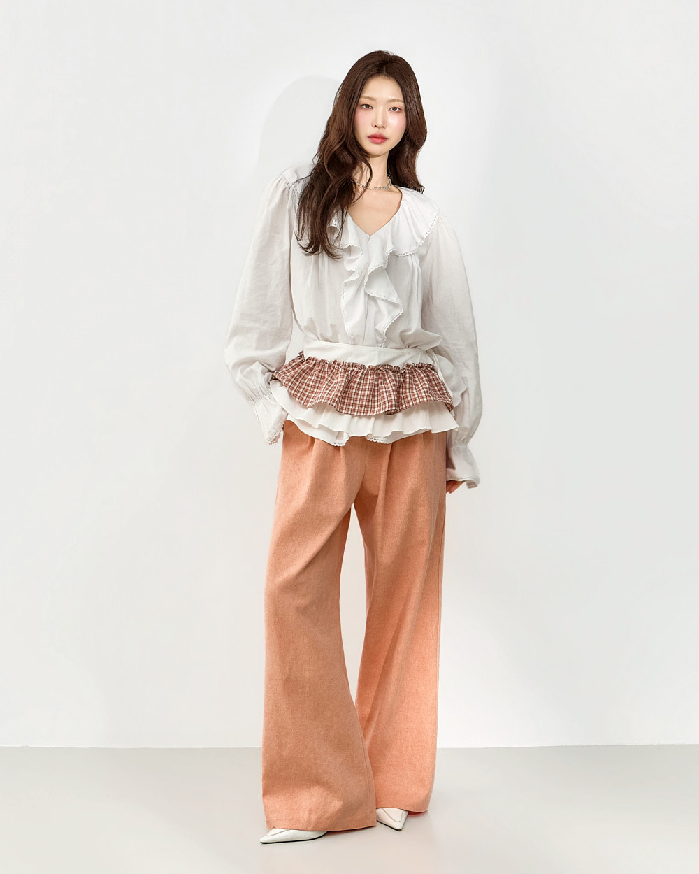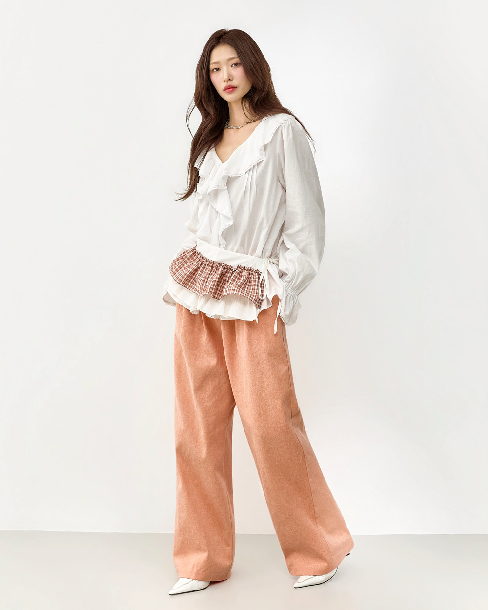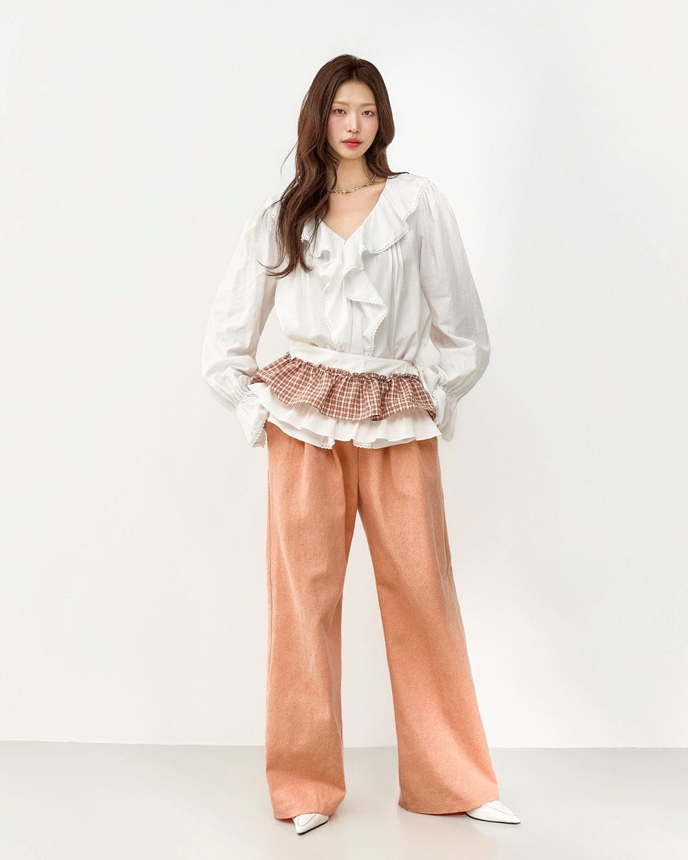 네크라인부터 자연스럽게 이어지는 프릴 디테일로