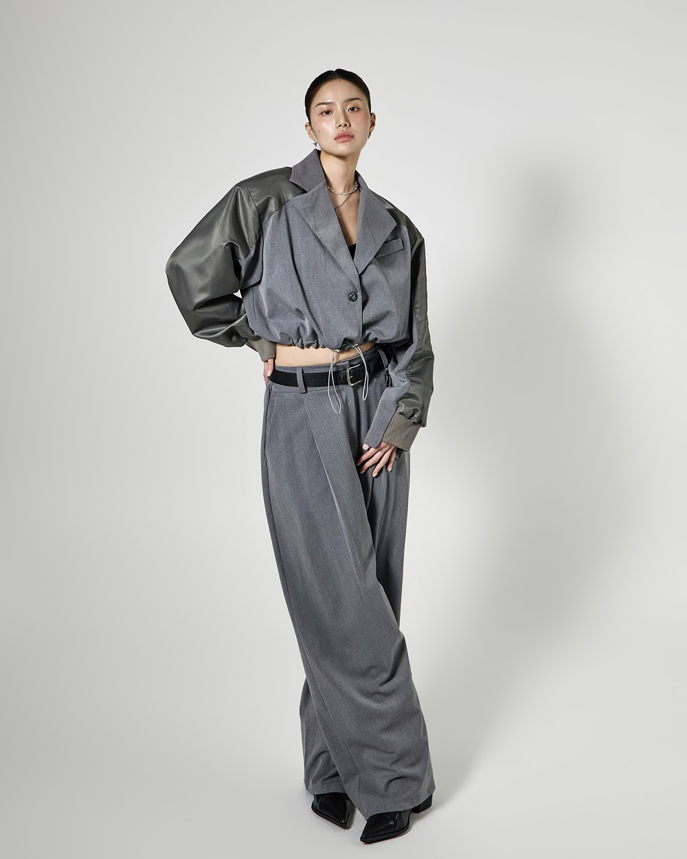 전체 룩을 안정감 있게 잡아주어 세련된 밸런스를 완성합니다.