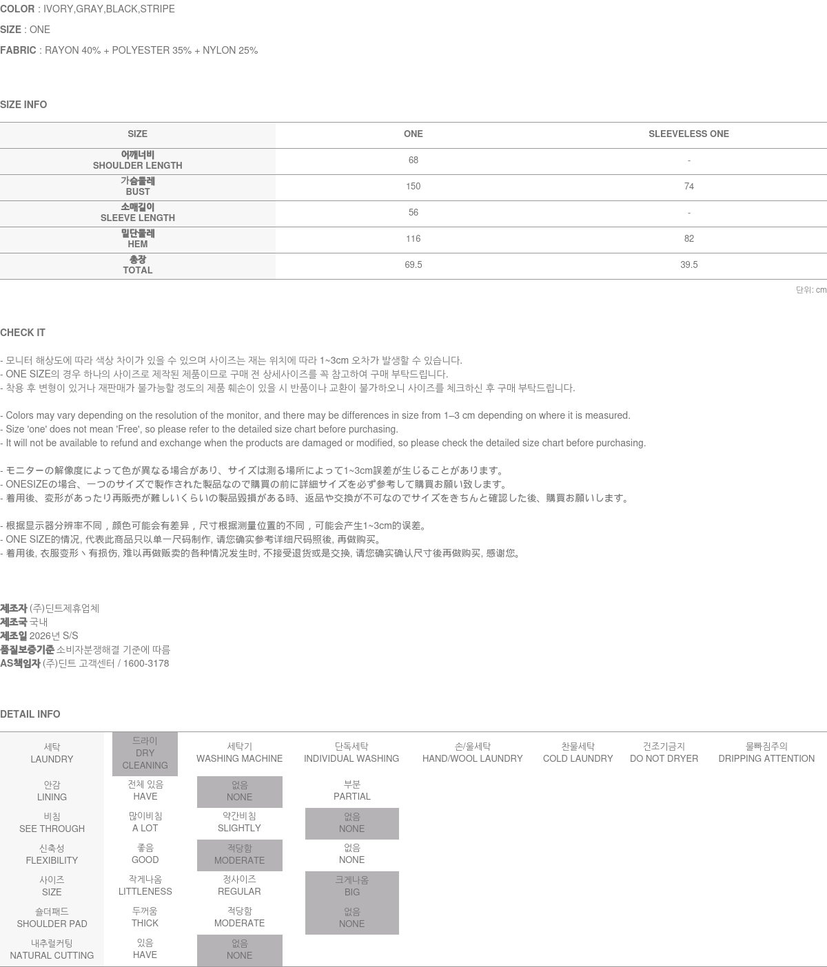 171CM 모델 ONE 사이즈, STRIPE 컬러 착용하였습니다.