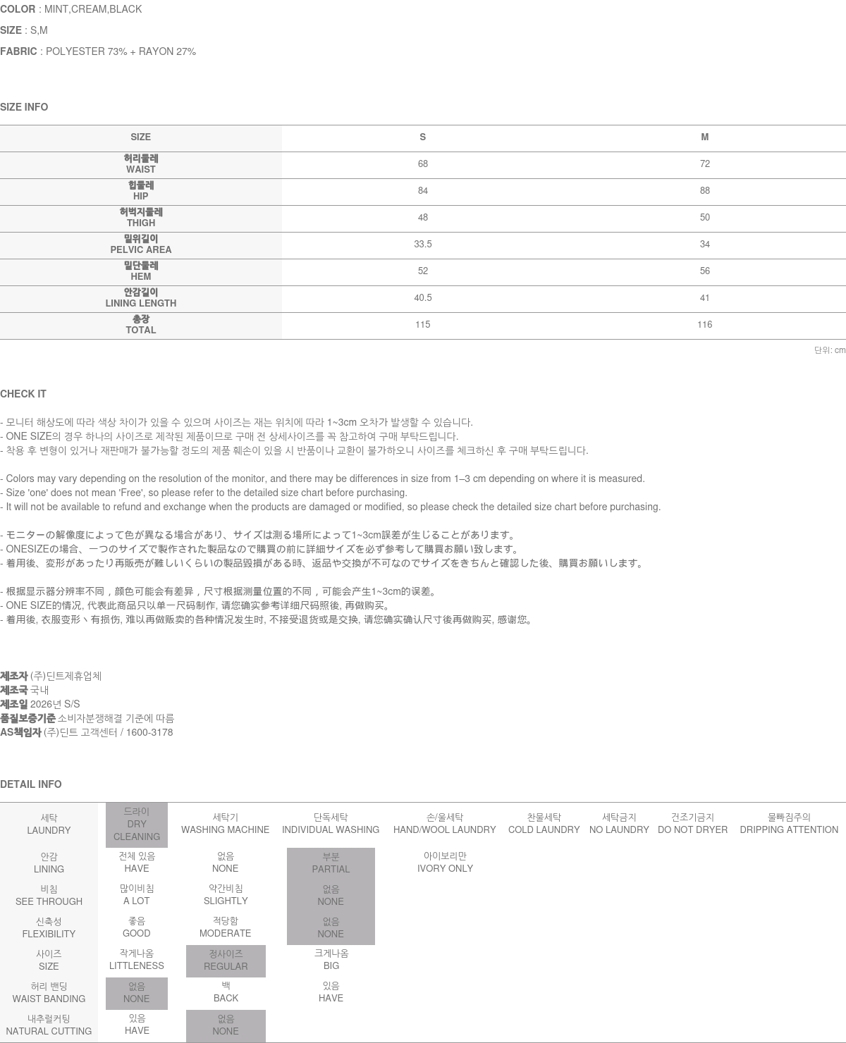 174CM 모델 S 사이즈, MINT 컬러 착용하였습니다.